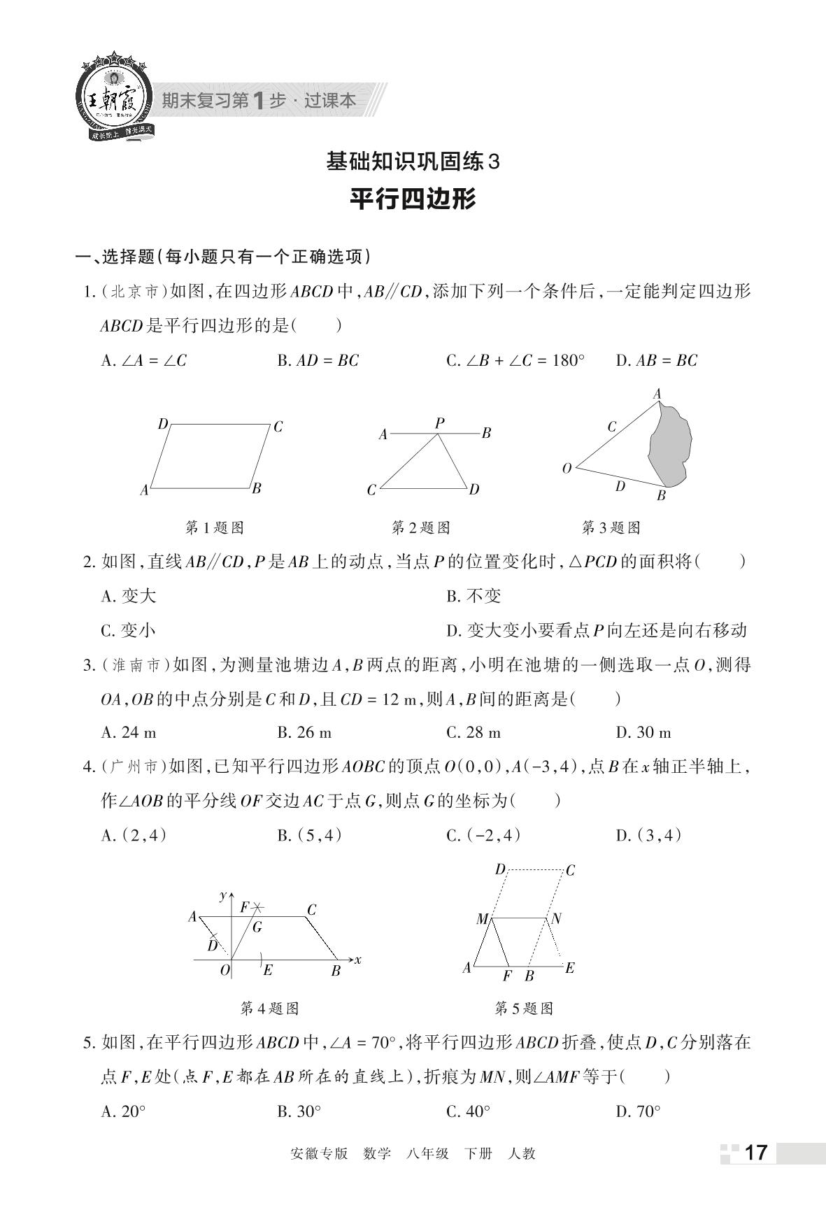 王朝霞期末过课本——基础知识巩固练3 平行四边形八年级下册数学(人教版)