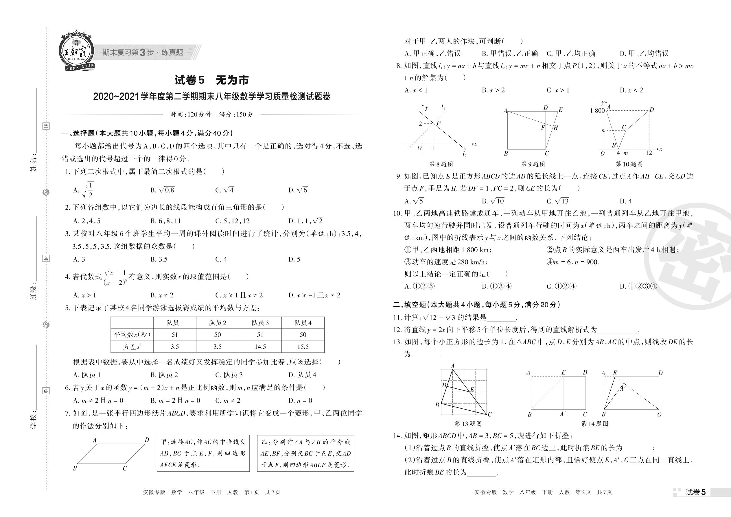 无为市2020~2021学年度第二学期期末八年级数学学习质量检测试题卷(人教版)【5】
