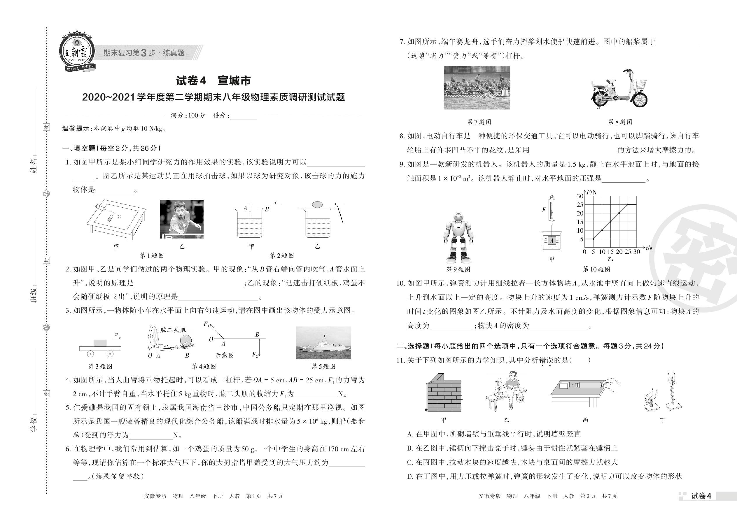 宣城市2020~2021学年度第二学期期末八年级物理素质调研测试试题(人教版)【4】