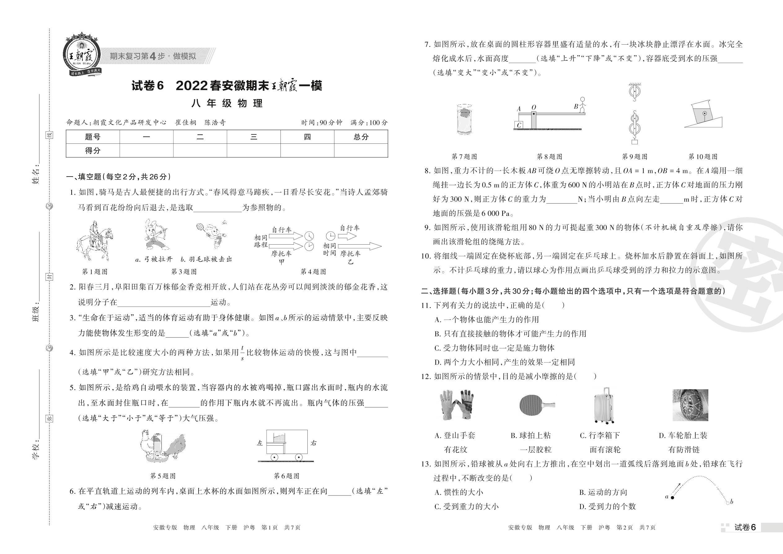 王朝霞期末模拟卷八年级下册物理(沪粤版)【6】