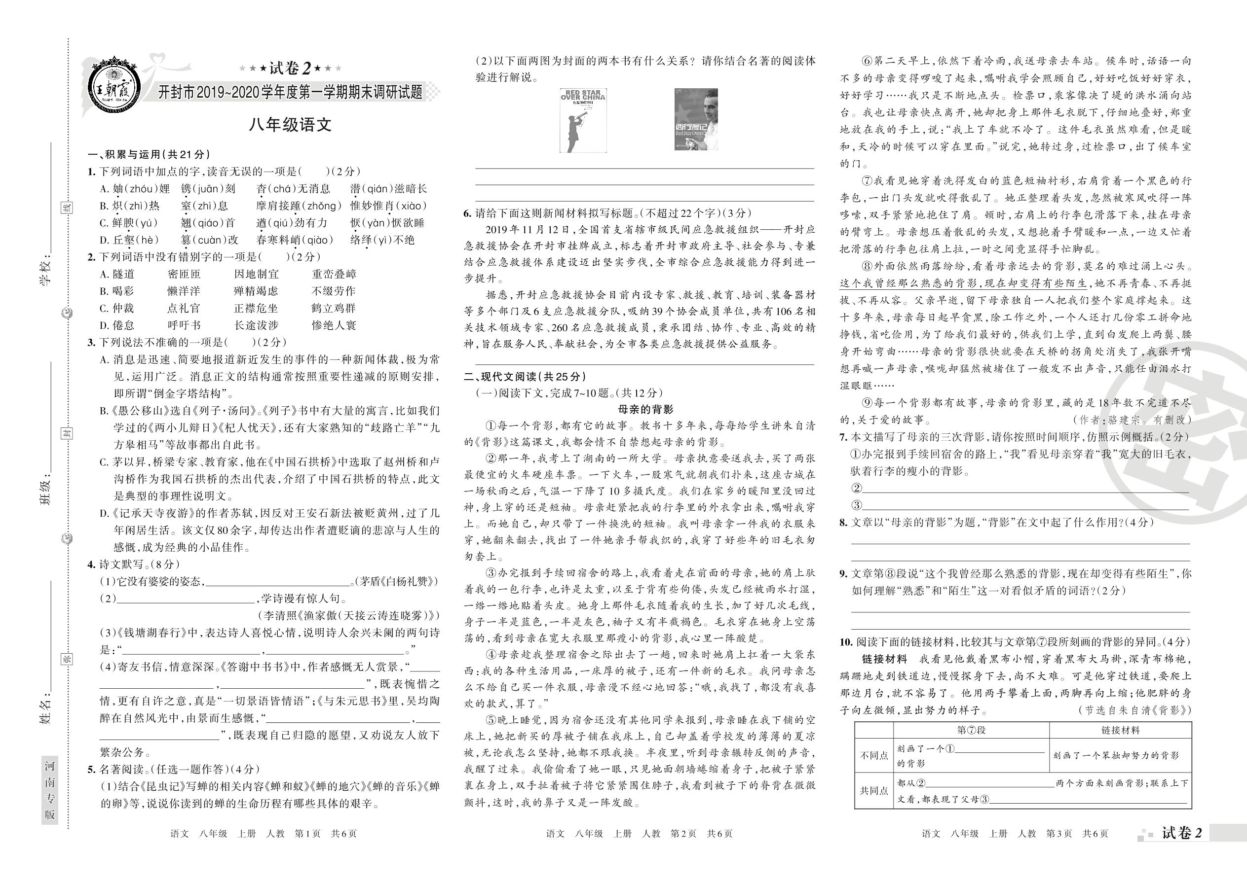 2019-2020学年第一学期开封市八年级语文试卷(人教版)【2】