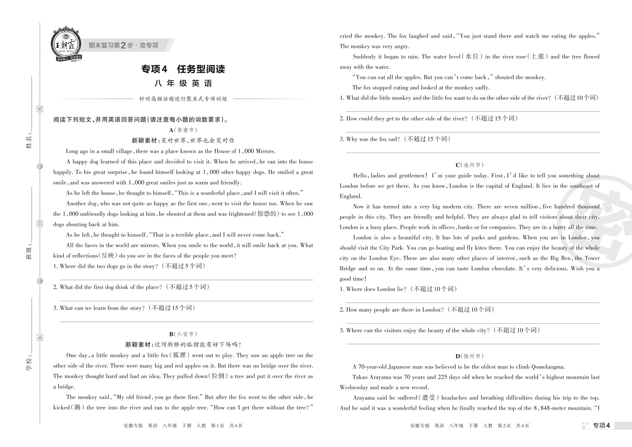 王朝霞期末专项卷——任务型阅读八年级下册英语(人教版)【4】