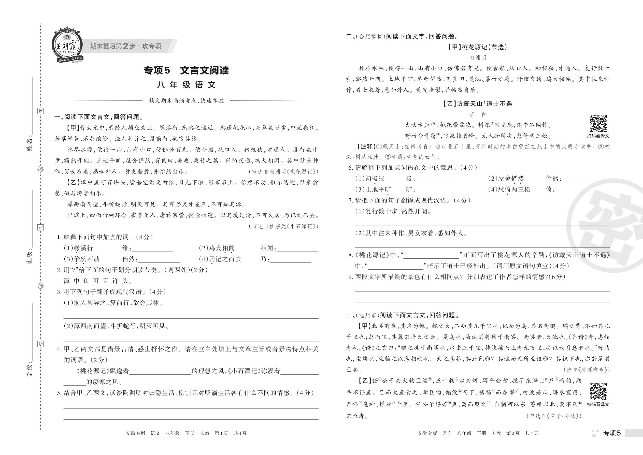 王朝霞期末专项卷——文言文阅读八年级下册语文(人教版)【5】