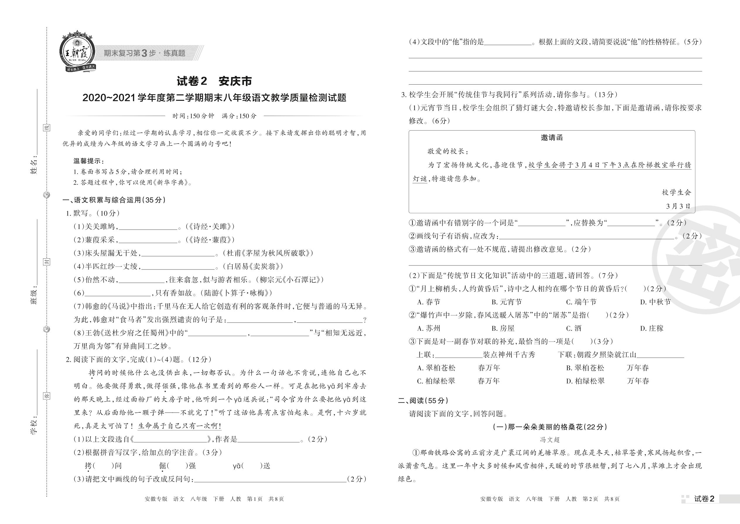 安庆市2020~2021学年度第二学期期末八年级语文教学质量检测试题(人教版)【2】