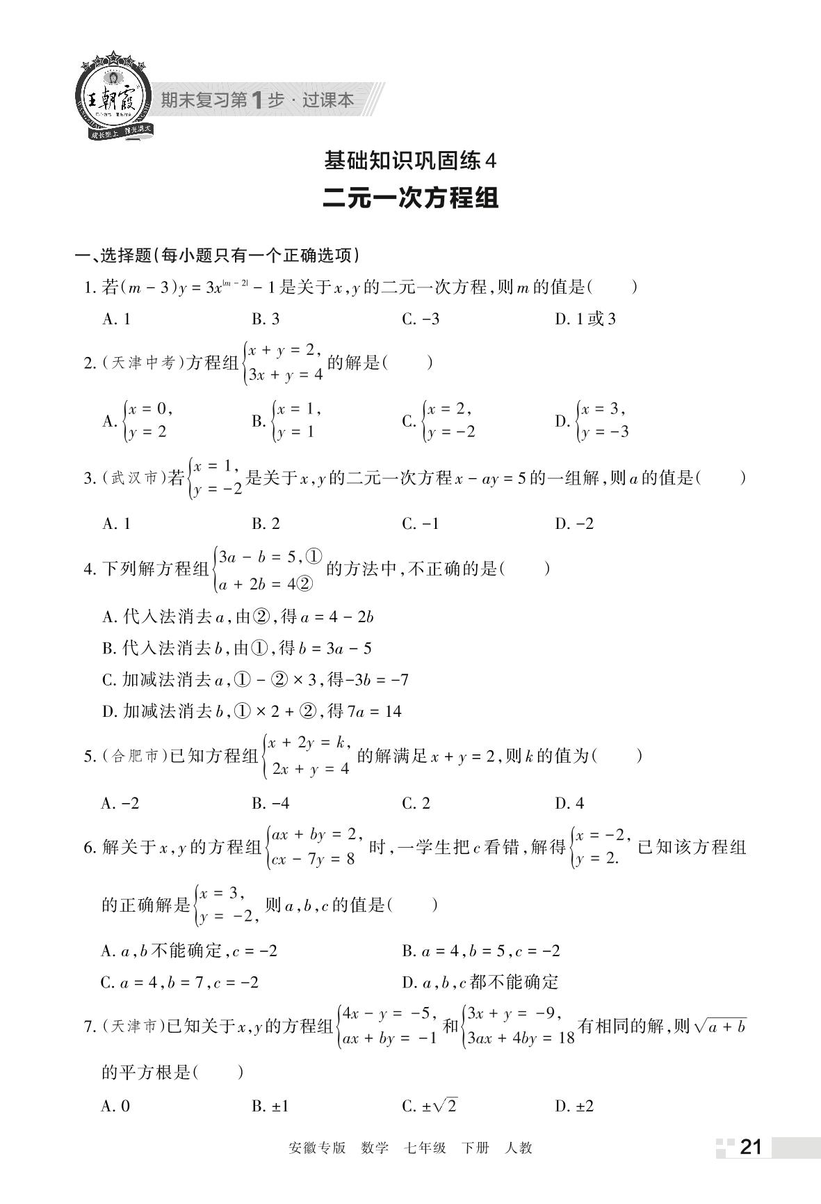 王朝霞期末过课本——基础知识巩固练4 二元一次方程组七年级下册数学(人教版)