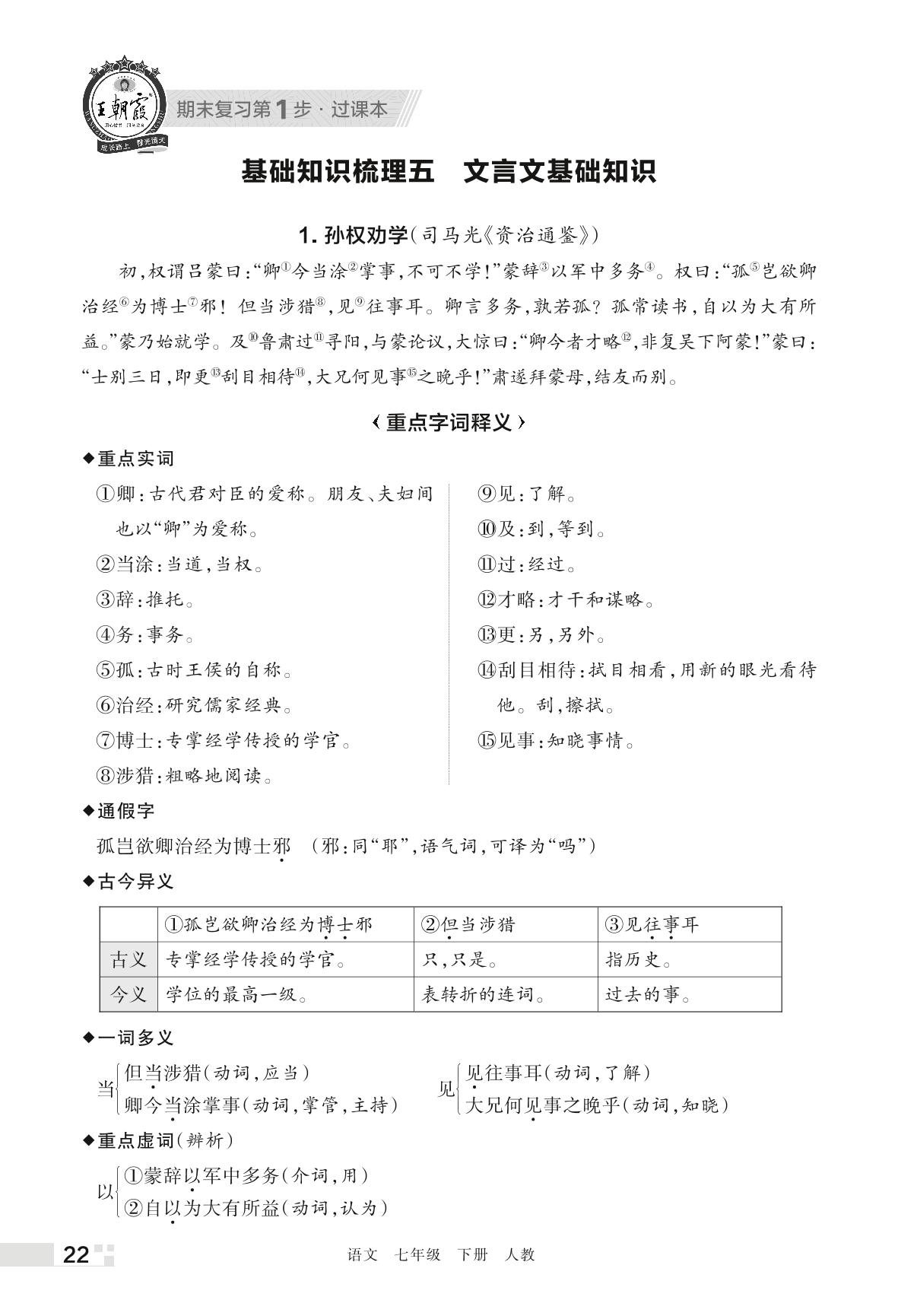 王朝霞期末过课本——基础知识梳理五 文言文基础知识七年级下册语文(人教版)