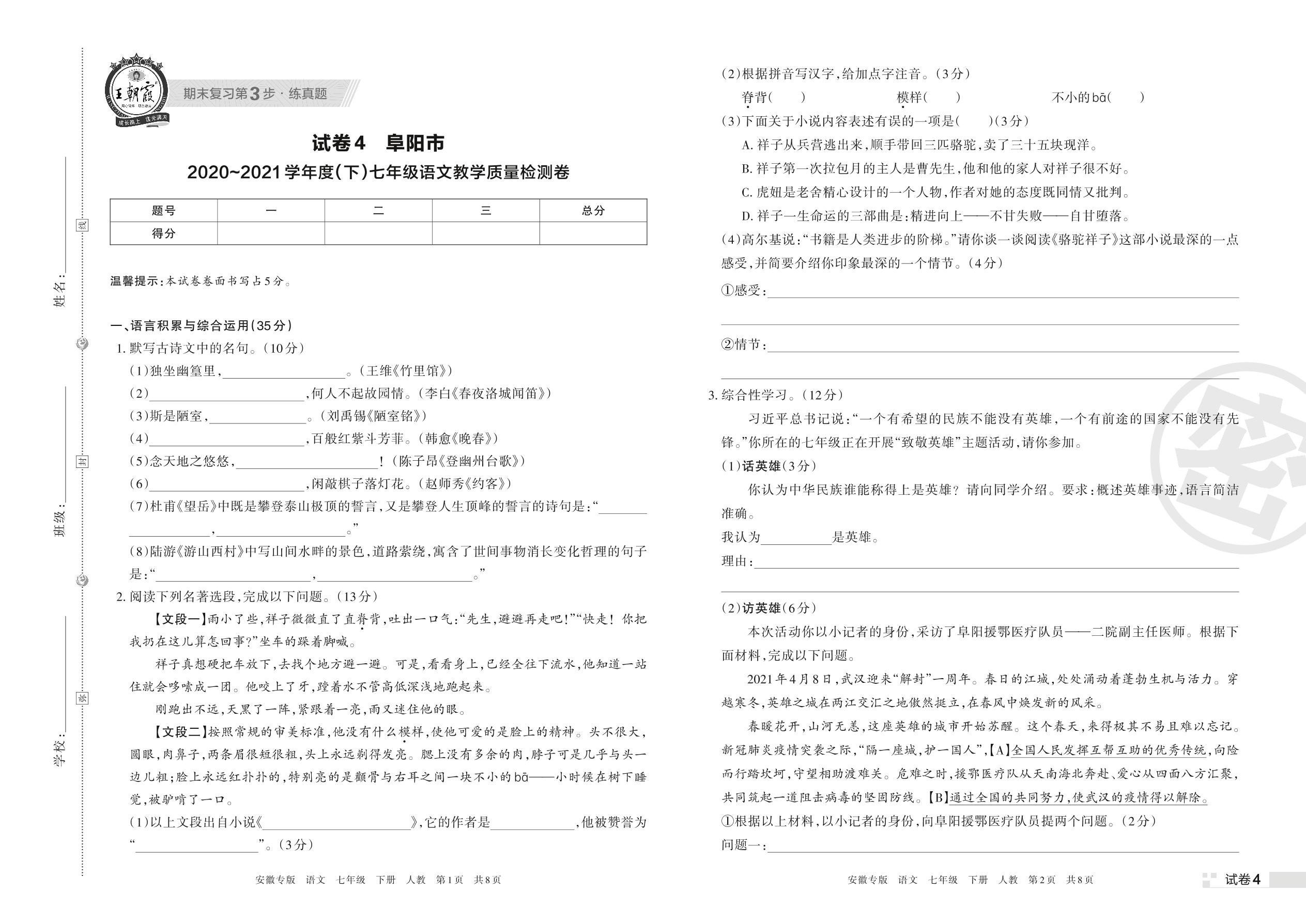 阜阳市2020~2021学年度(下)七年级语文教学质量检测卷(人教版)【4】