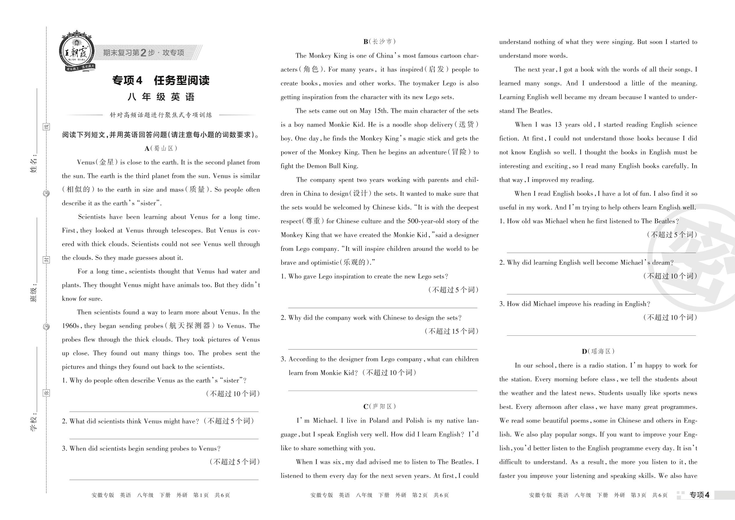 王朝霞期末专项卷——任务型阅读八年级下册英语(外研版)【4】