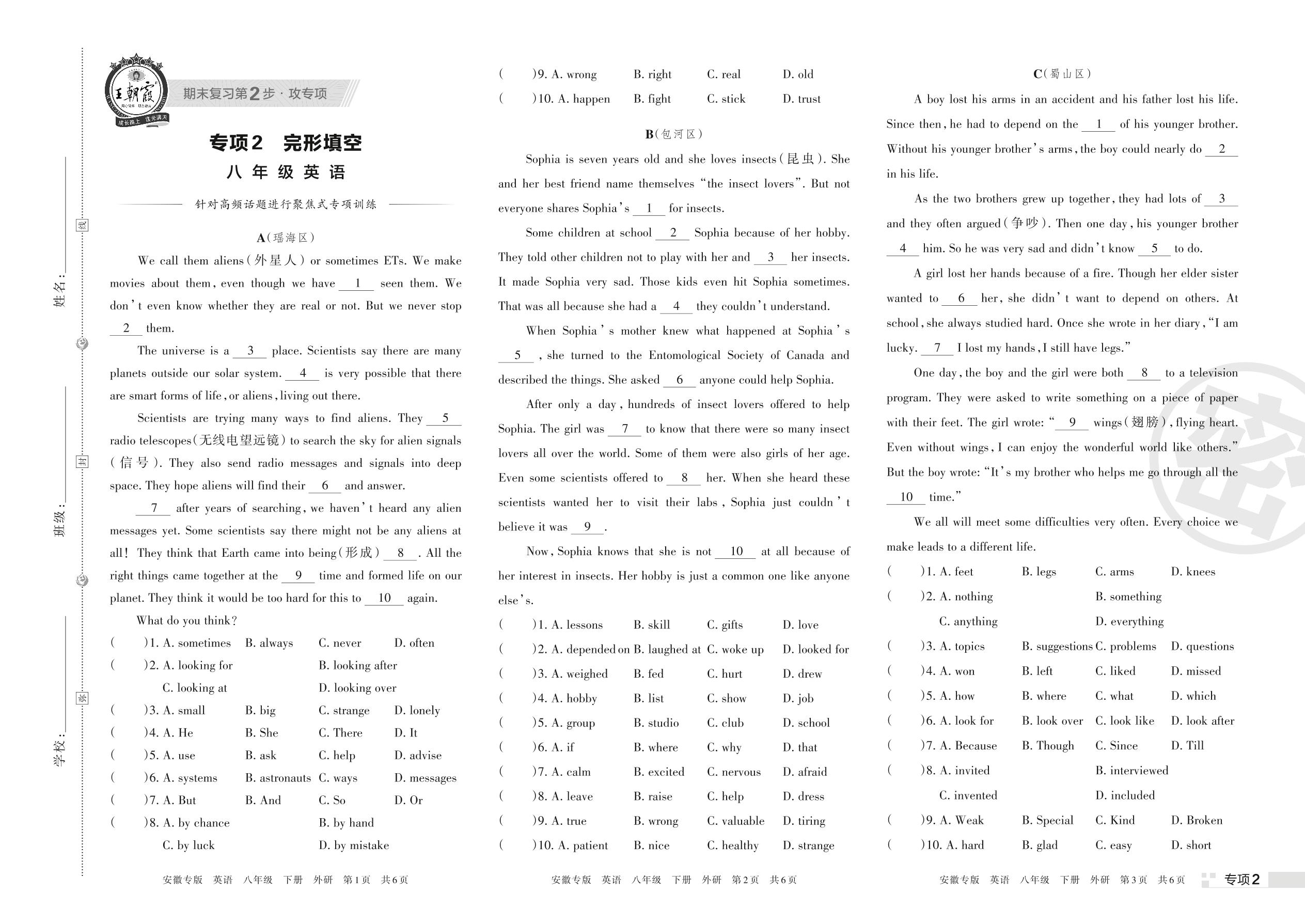 王朝霞期末专项卷——完形填空八年级下册英语(外研版)【2】