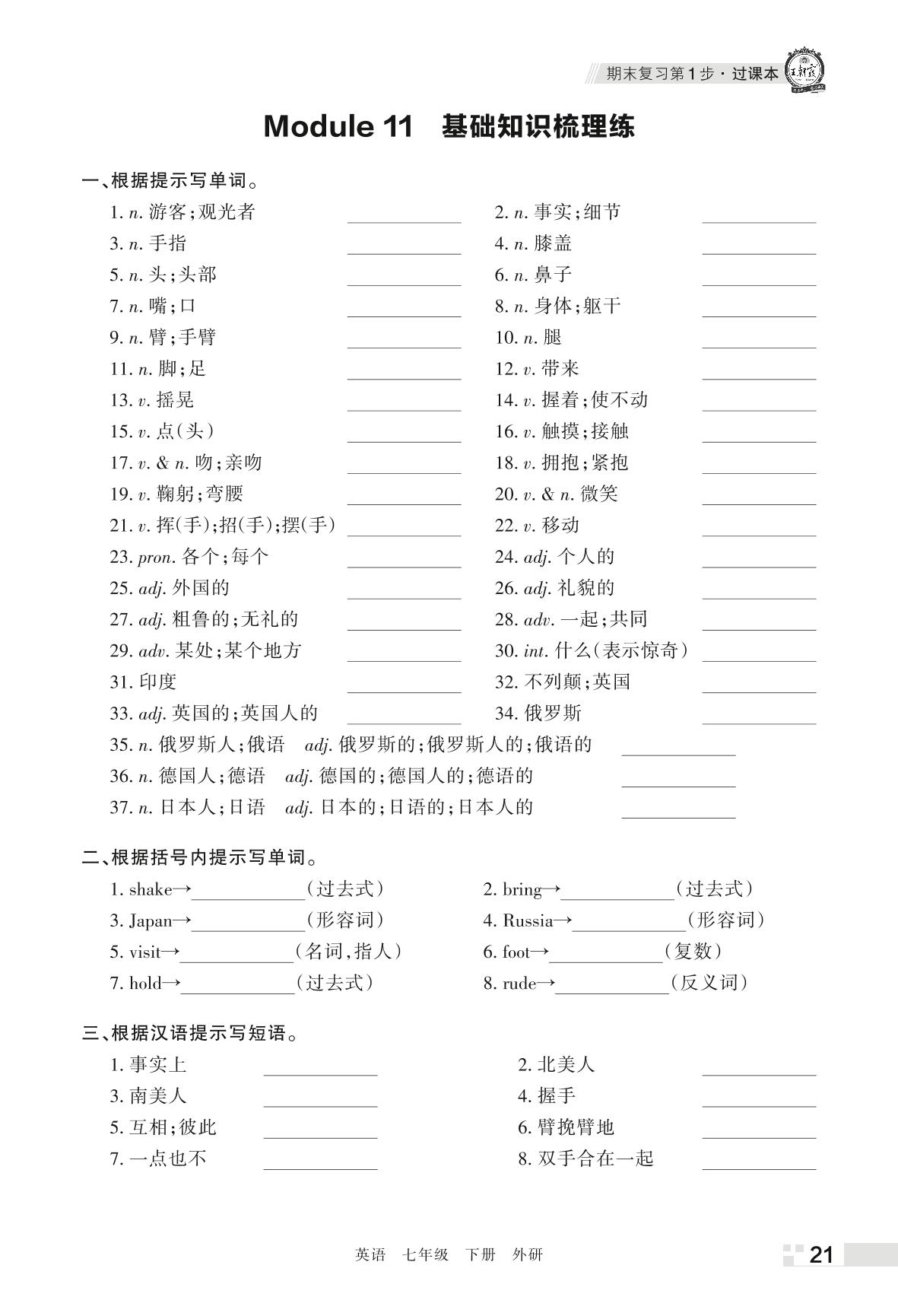 王朝霞期末过课本——Module 11 基础知识梳理练七年级下册英语(外研版)