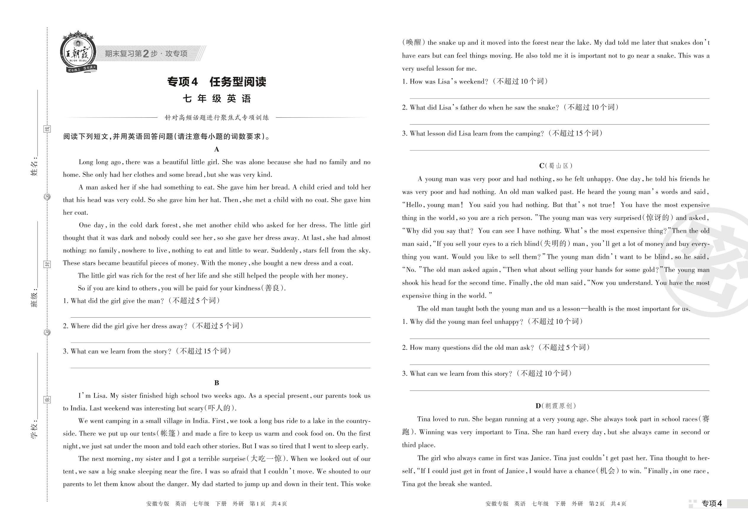 王朝霞期末专项卷——任务型阅读七年级下册英语(外研版)【4】