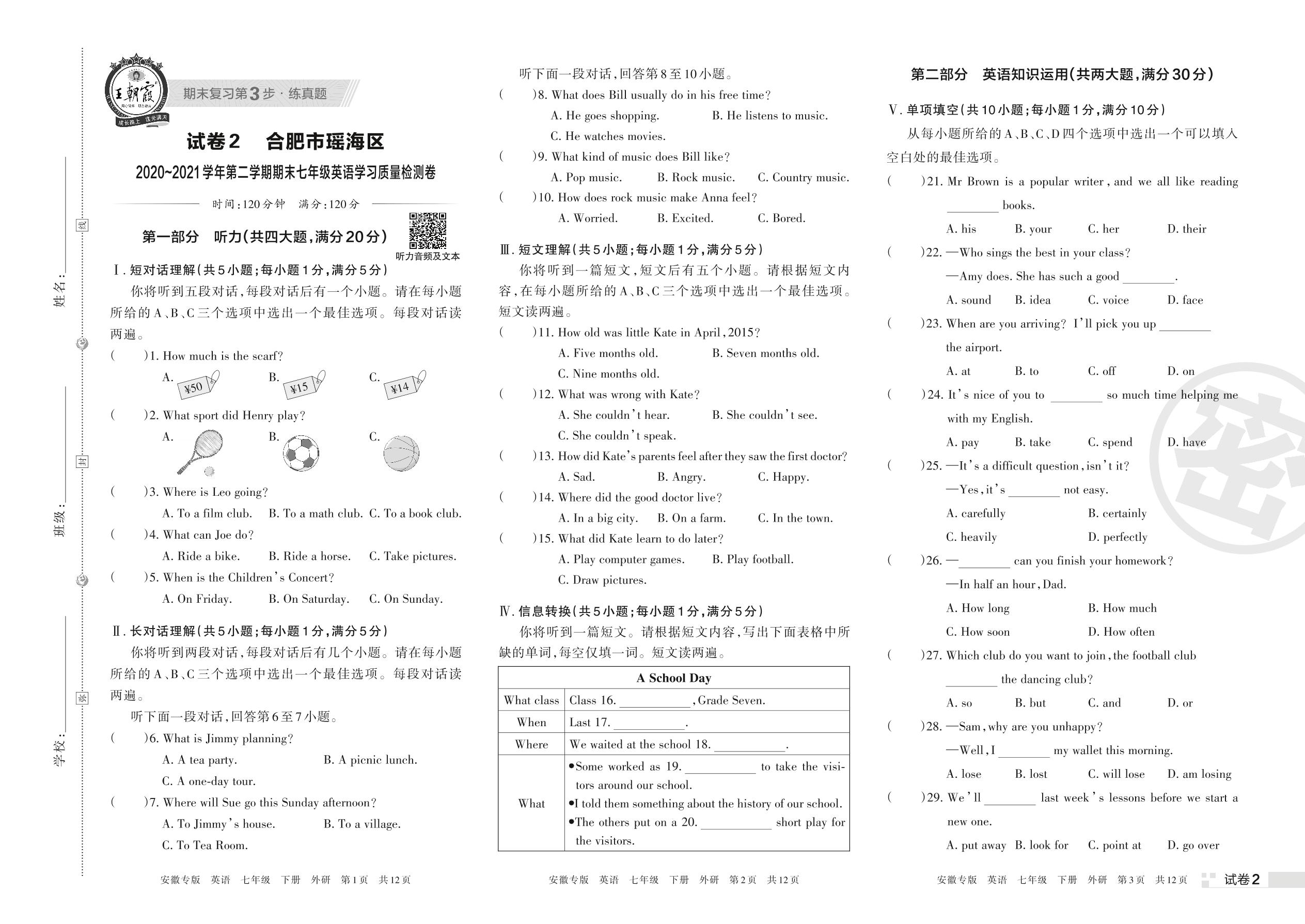 合肥市瑶海区2020~2021学年第二学期期末七年级英语学习质量检测卷(外研版)【2】
