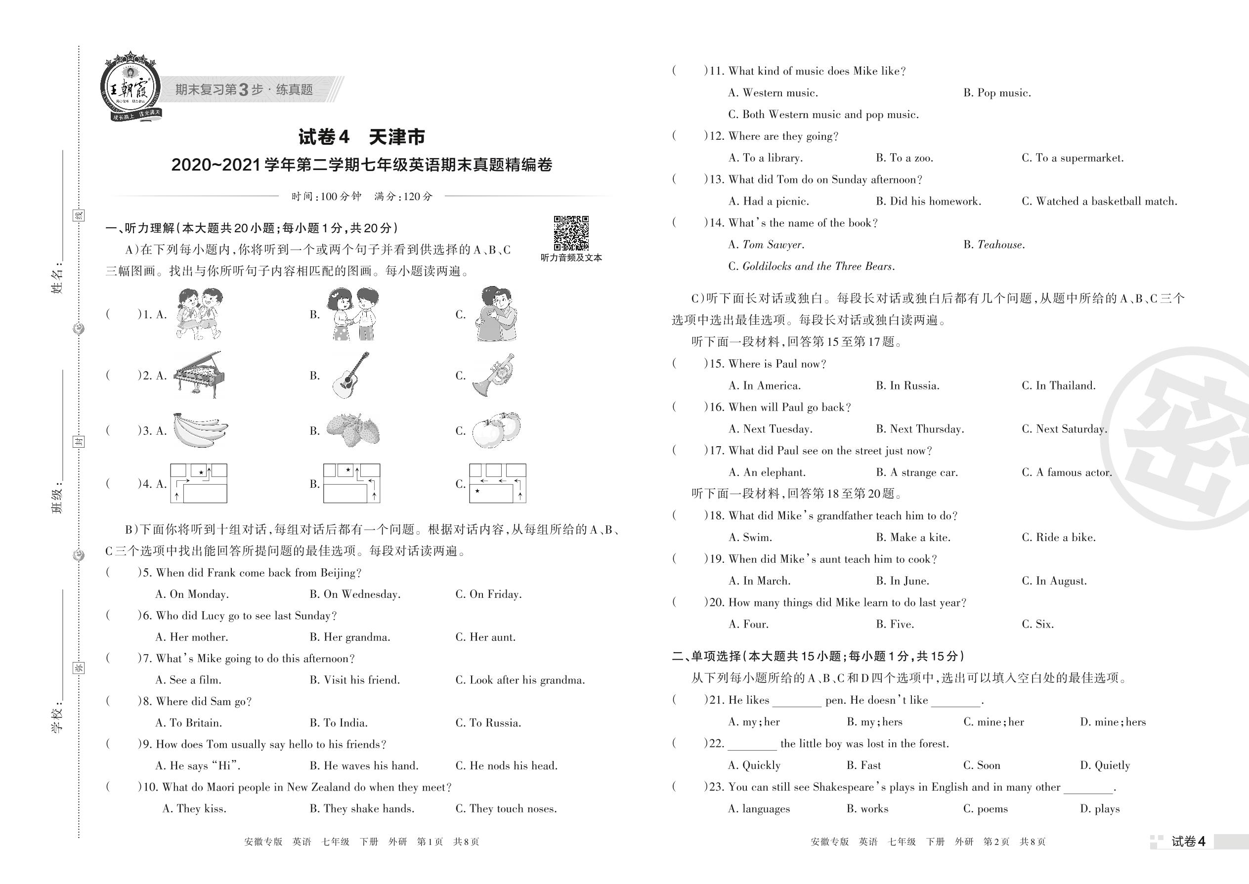 天津市2020~2021学年第二学期七年级英语期末真题精编卷(外研版)【4】
