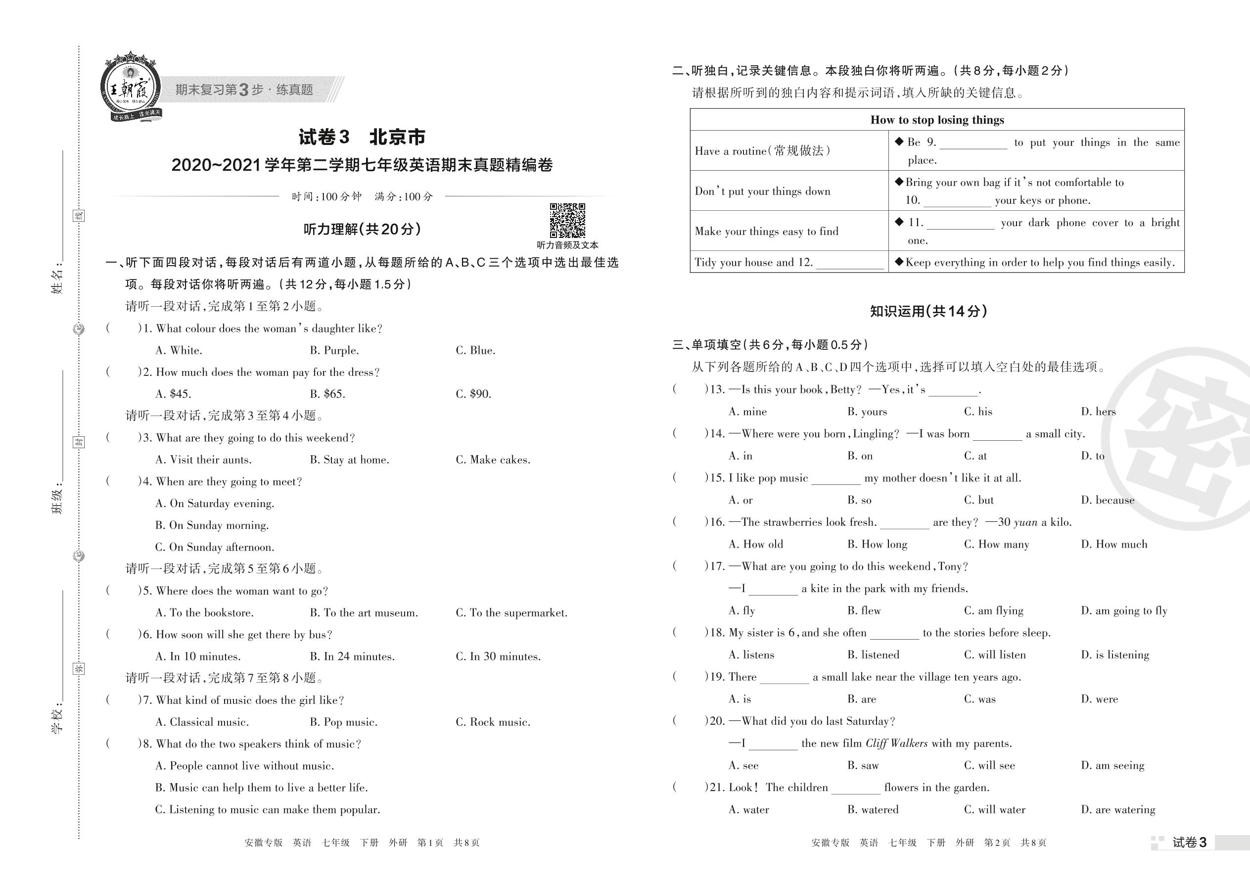 北京市2020~2021学年第二学期七年级英语期末真题精编卷(外研版)【3】