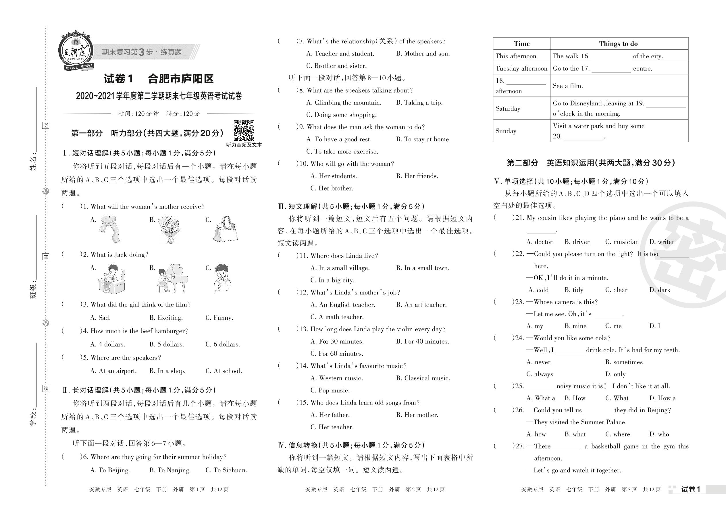 合肥市庐阳区2020~2021学年度第二学期期末七年级英语考试试卷(外研版)【1】