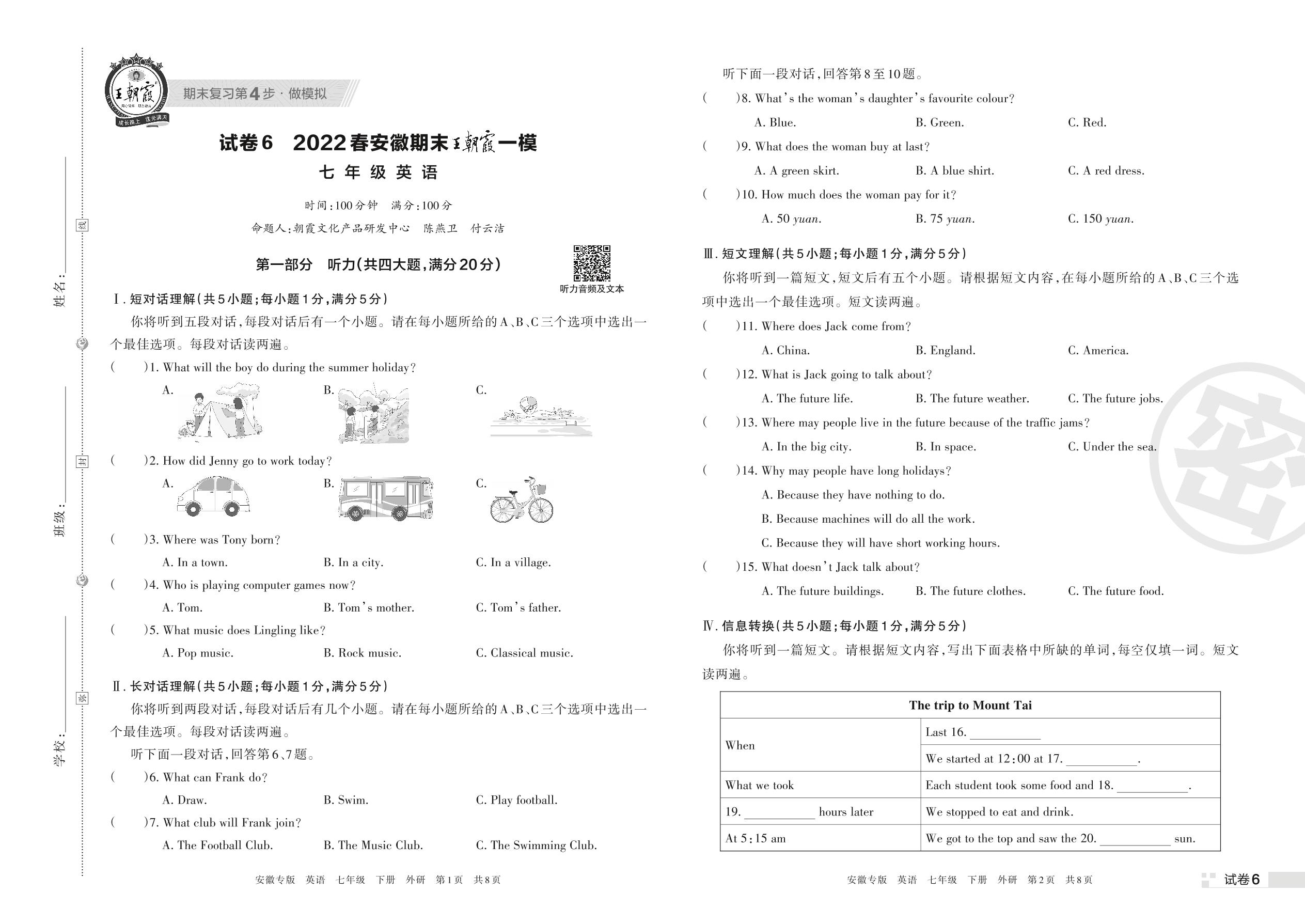 王朝霞期末模拟卷七年级下册英语(外研版)【6】
