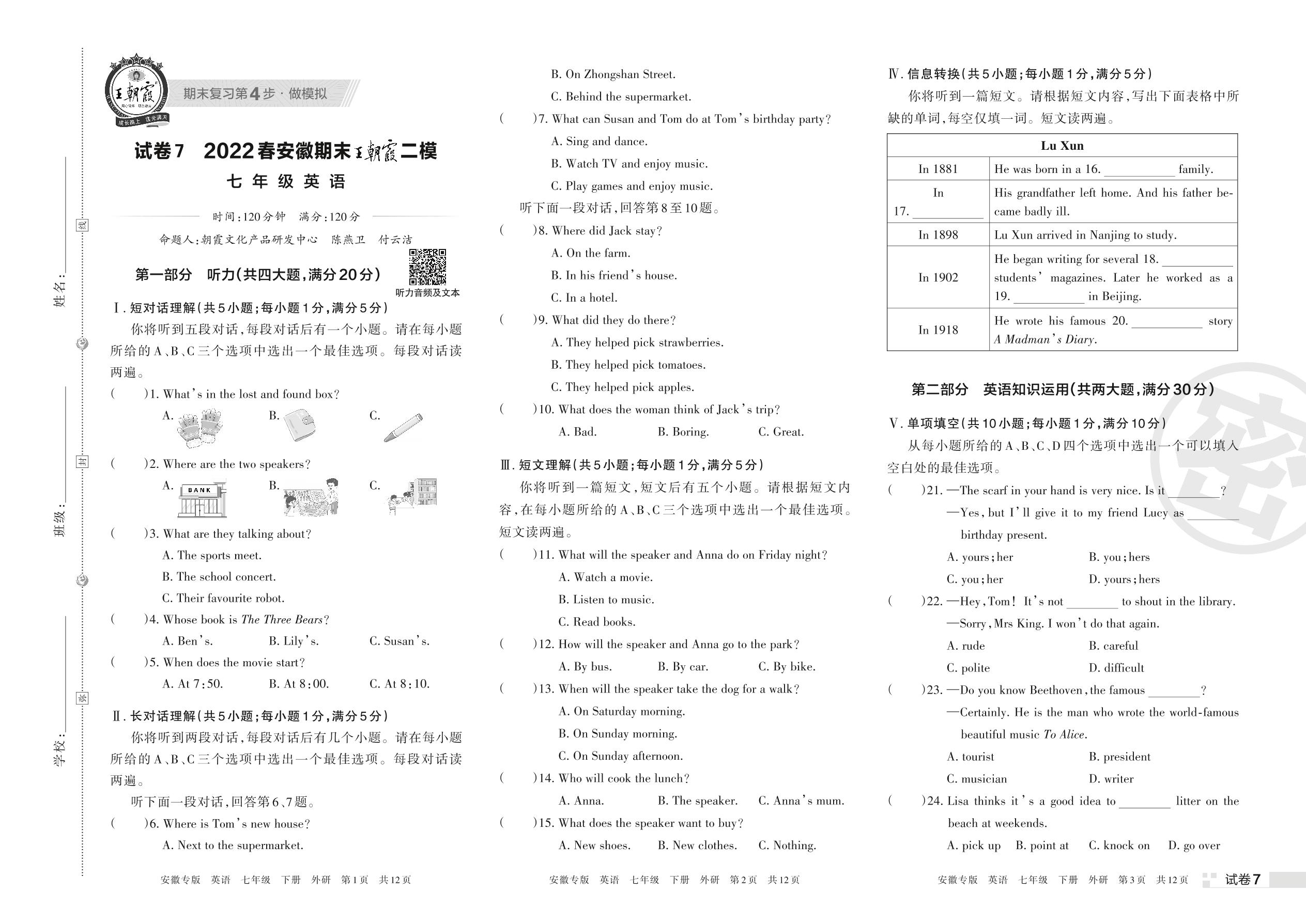 王朝霞期末模拟卷七年级下册英语(外研版)【7】