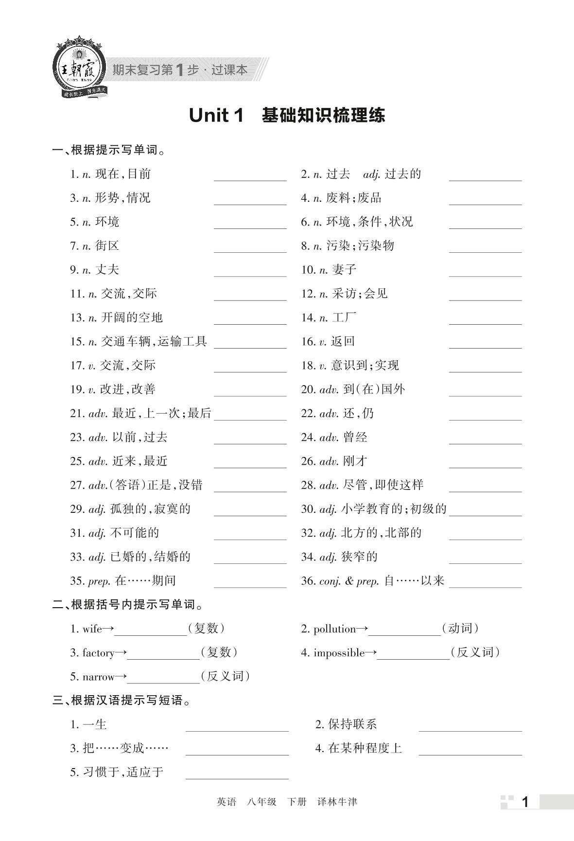 王朝霞期末过课本——Unit 1 基础知识梳理练八年级下册英语(译林牛津版)