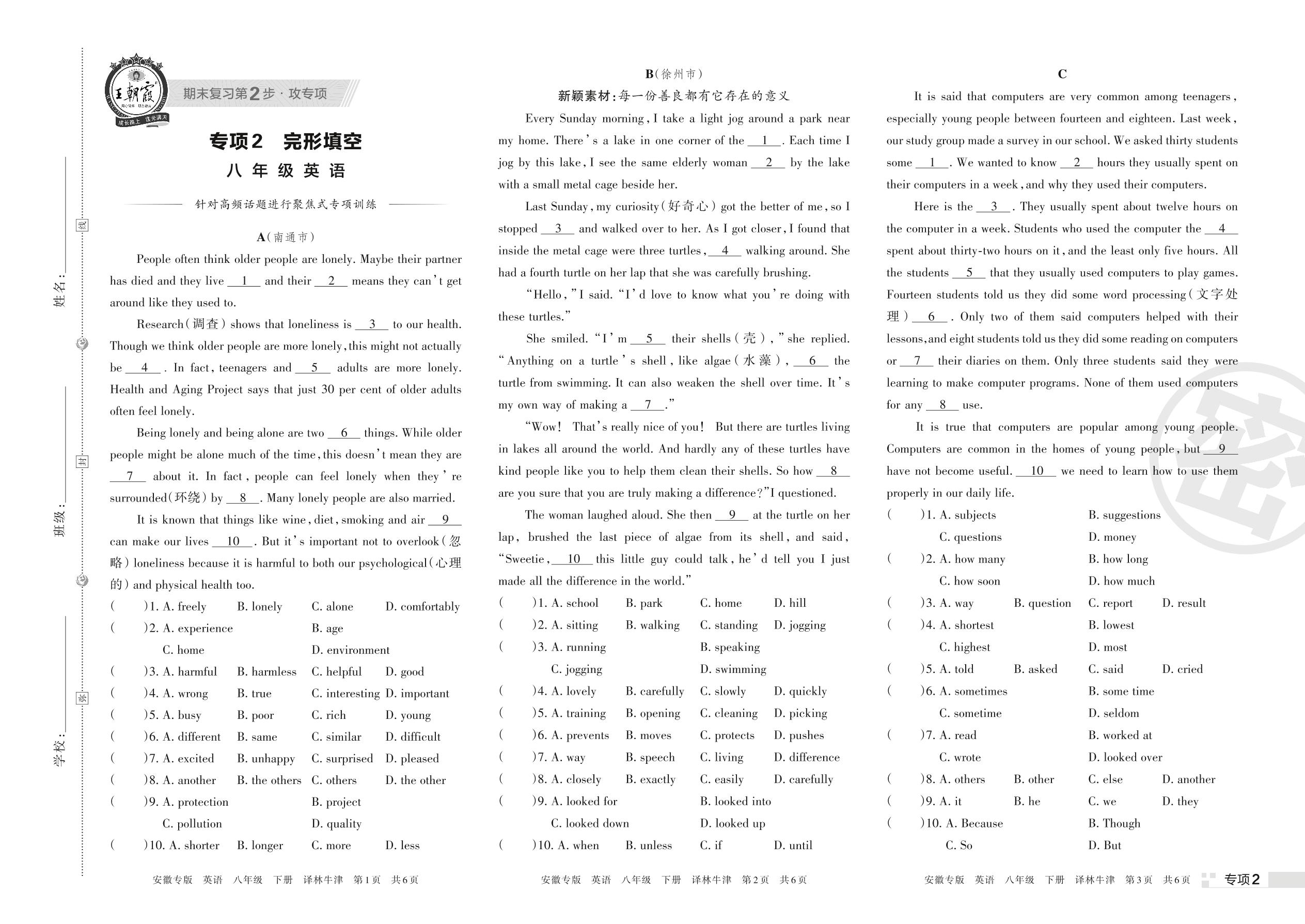 王朝霞期末专项卷——完形填空八年级下册英语(译林牛津版)【2】