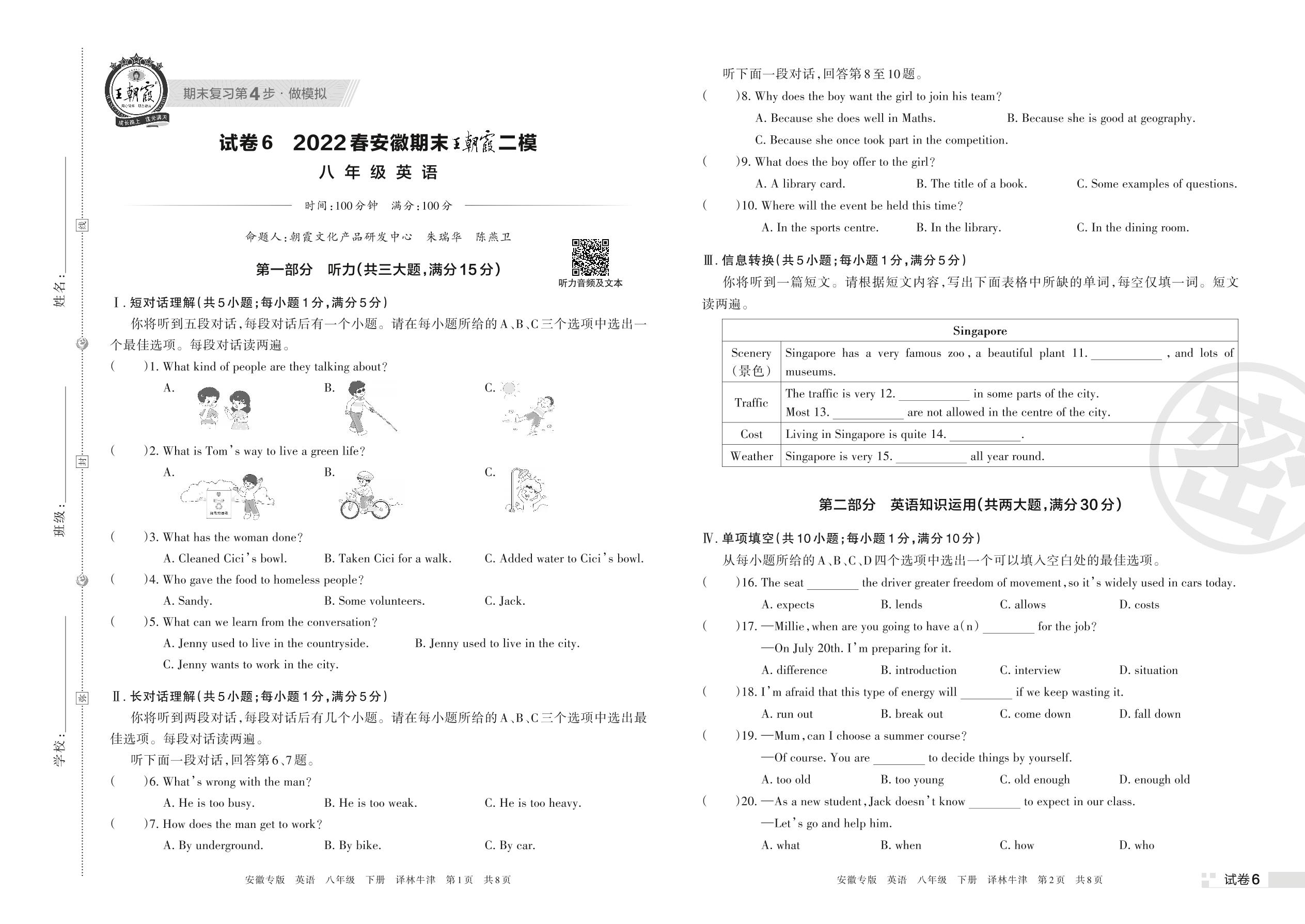 王朝霞期末模拟卷八年级下册英语(译林牛津版)【6】