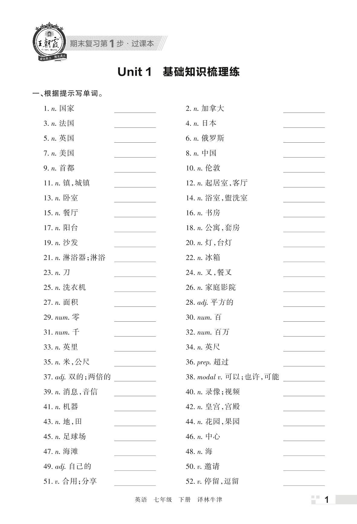 王朝霞期末过课本——Unit 1 基础知识梳理练七年级下册英语(译林牛津版)