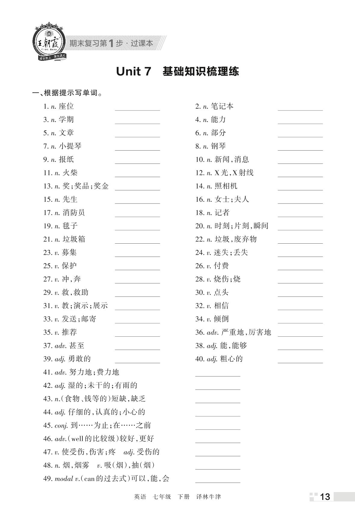 王朝霞期末过课本——Unit 7 基础知识梳理练七年级下册英语(译林牛津版)