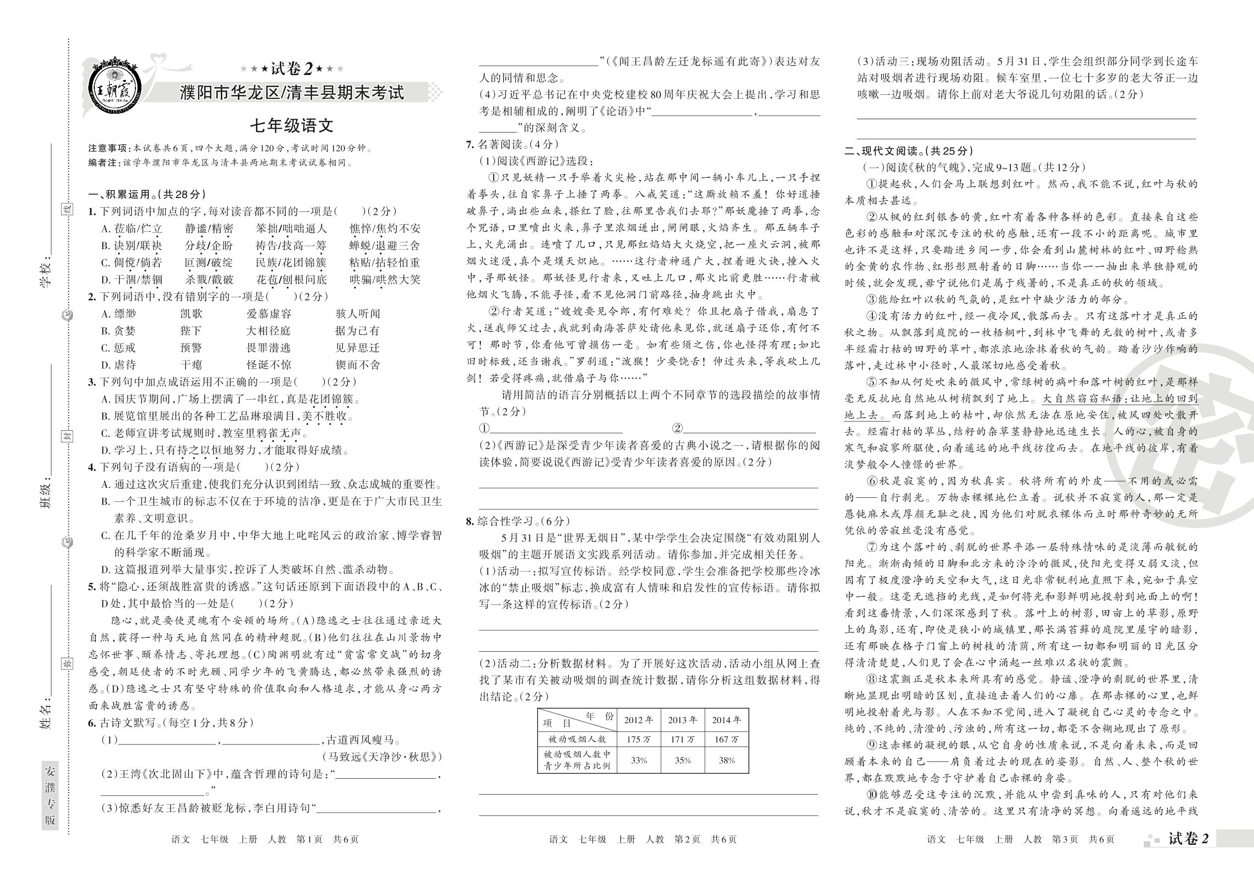 2019-2020学年第一学期濮阳市濮阳县华龙区、清丰县七年级语文试卷(人教版)【2】