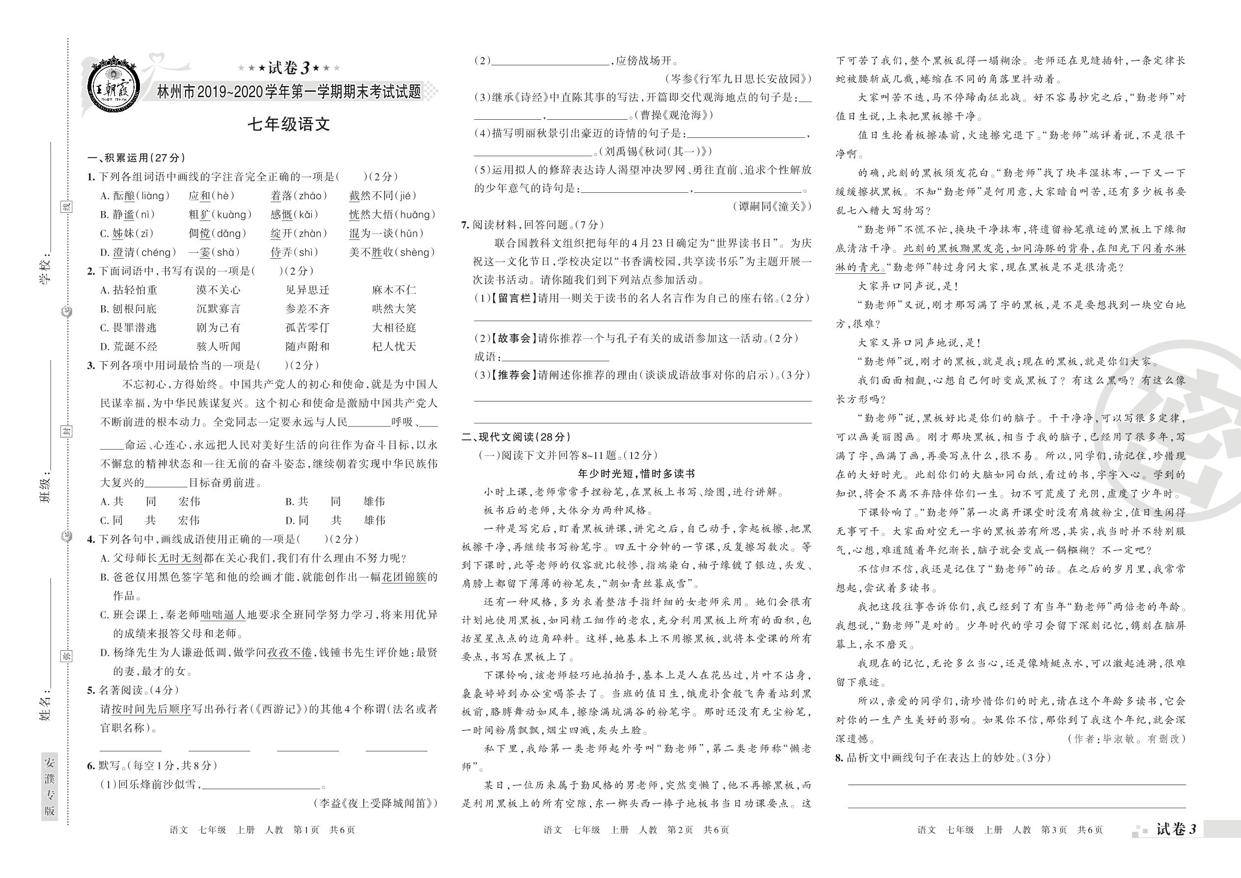 2019-2020学年第一学期林州市七年级语文试卷(人教版)【3】