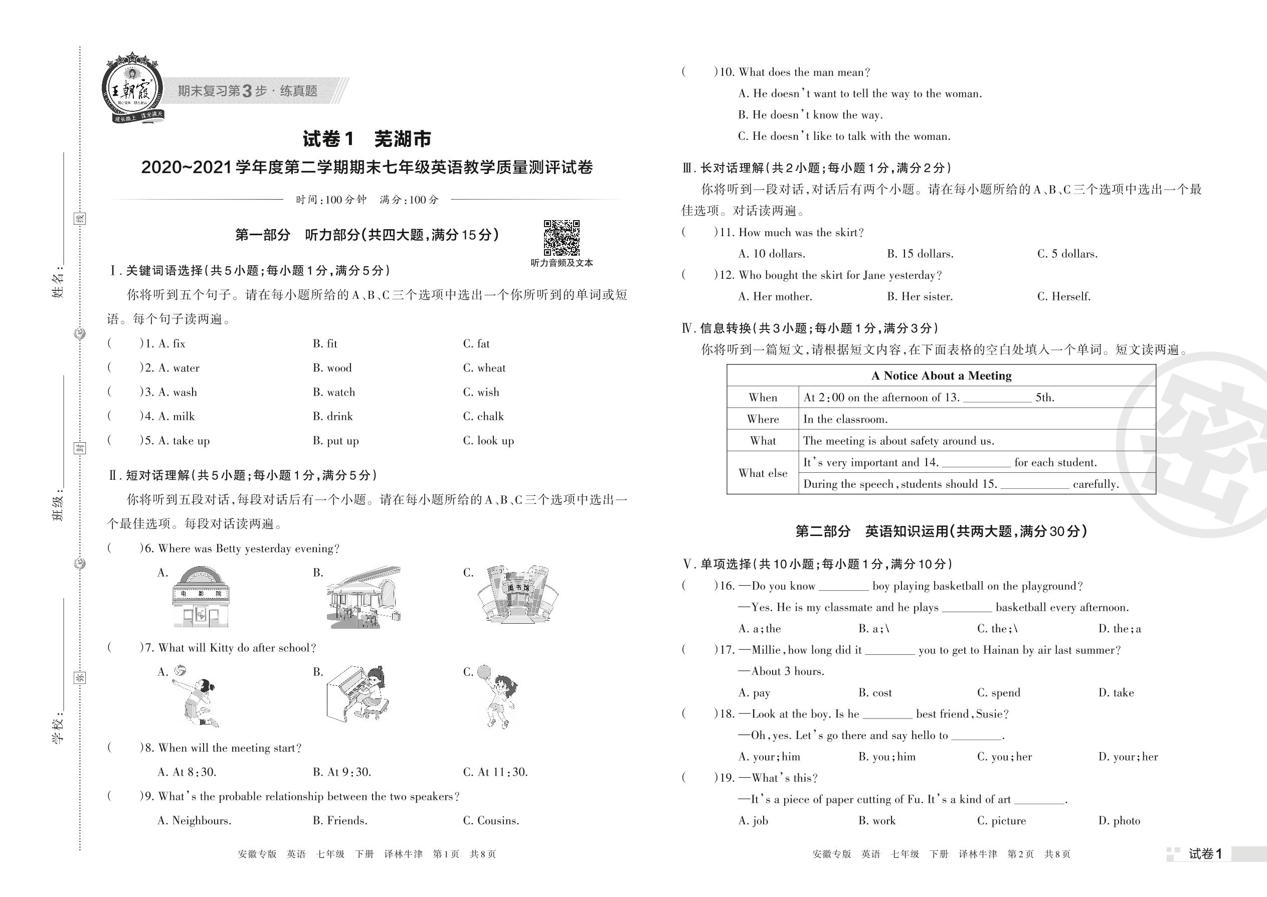 芜湖市2020~2021学年度第二学期期末七年级英语教学质量测评试卷(译林牛津版)【1】