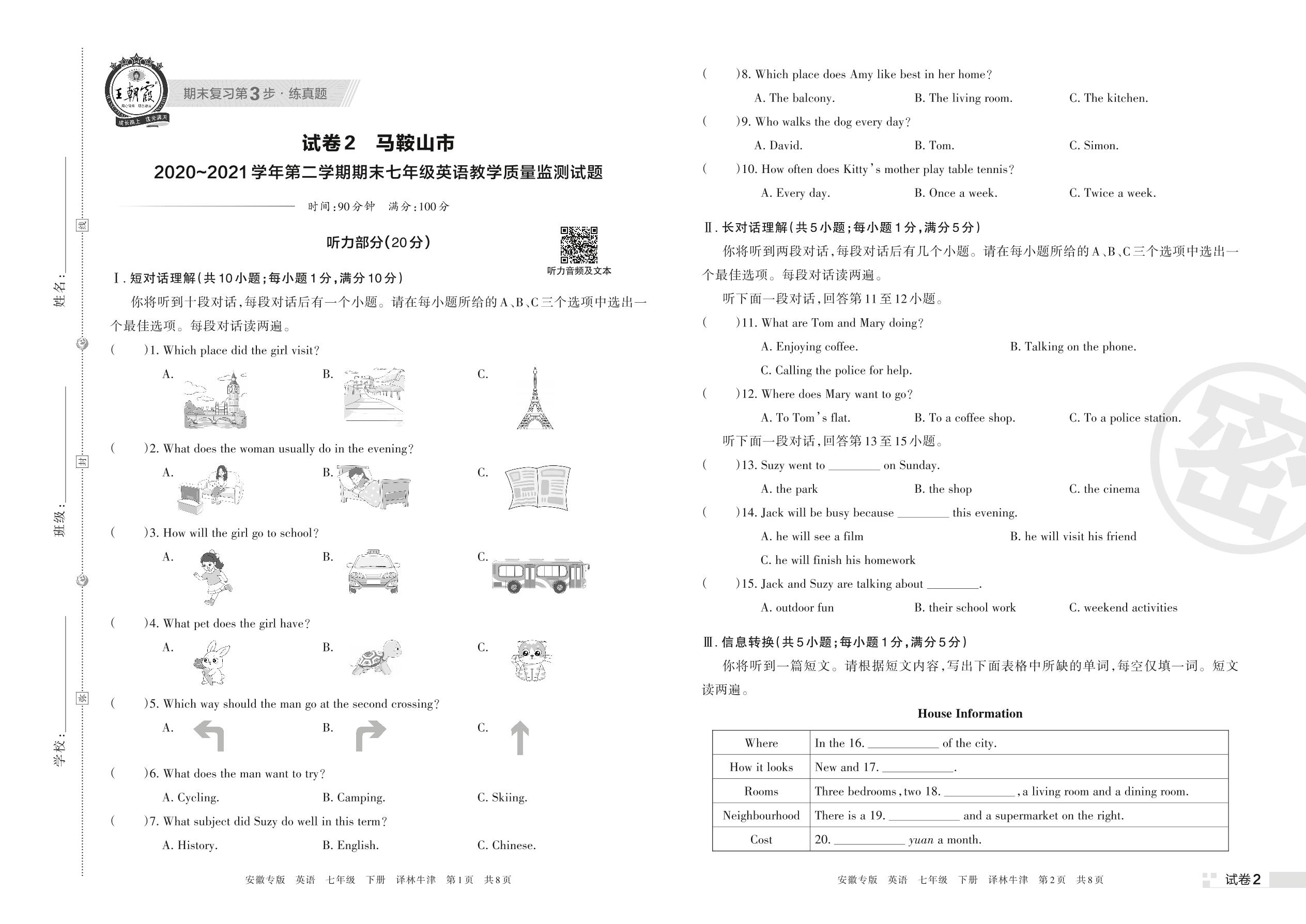 马鞍山市2020~2021学年第二学期期末七年级英语教学质量监测试题(译林牛津版)【2】