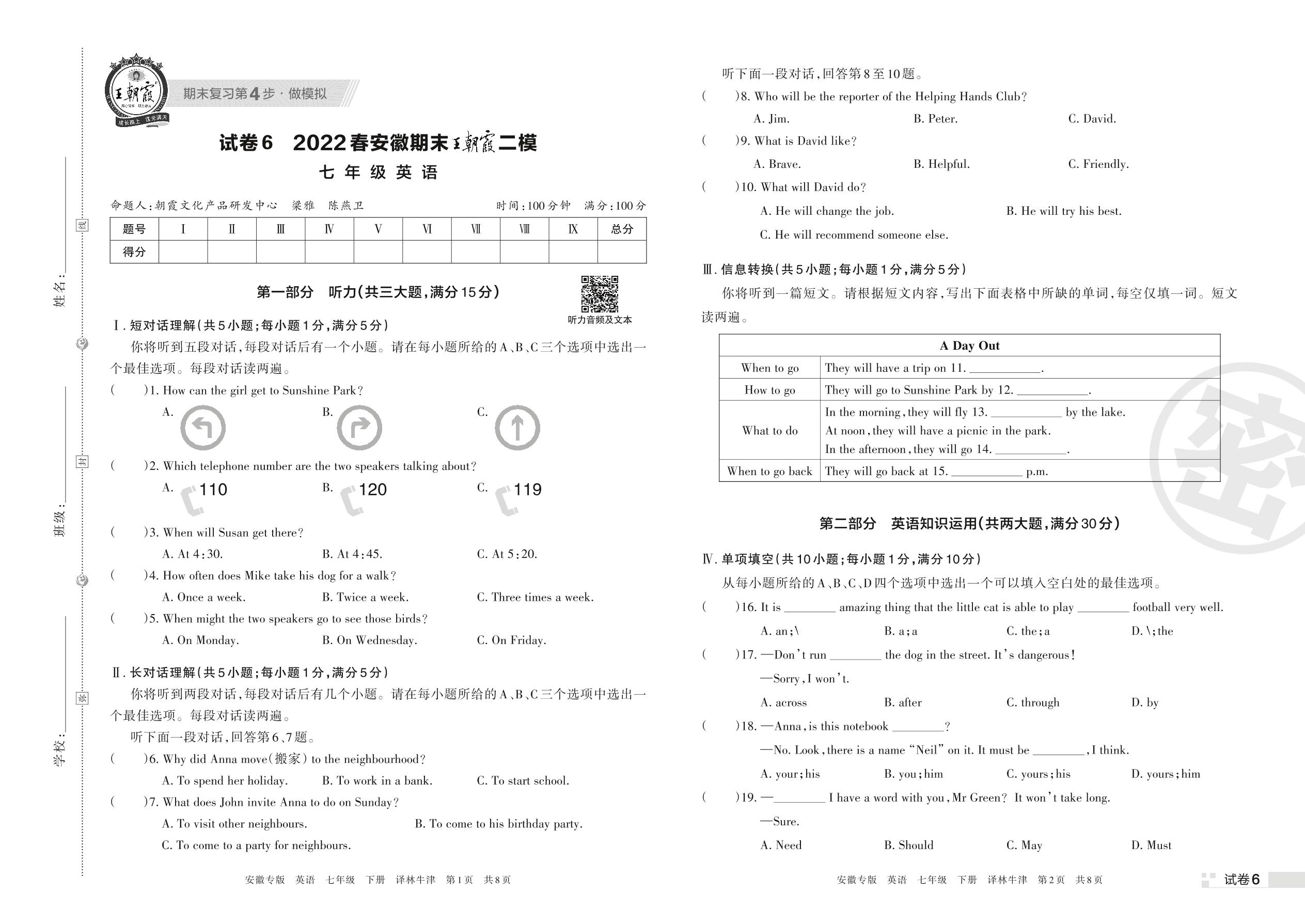 王朝霞期末模拟卷七年级下册英语(译林牛津版)【6】
