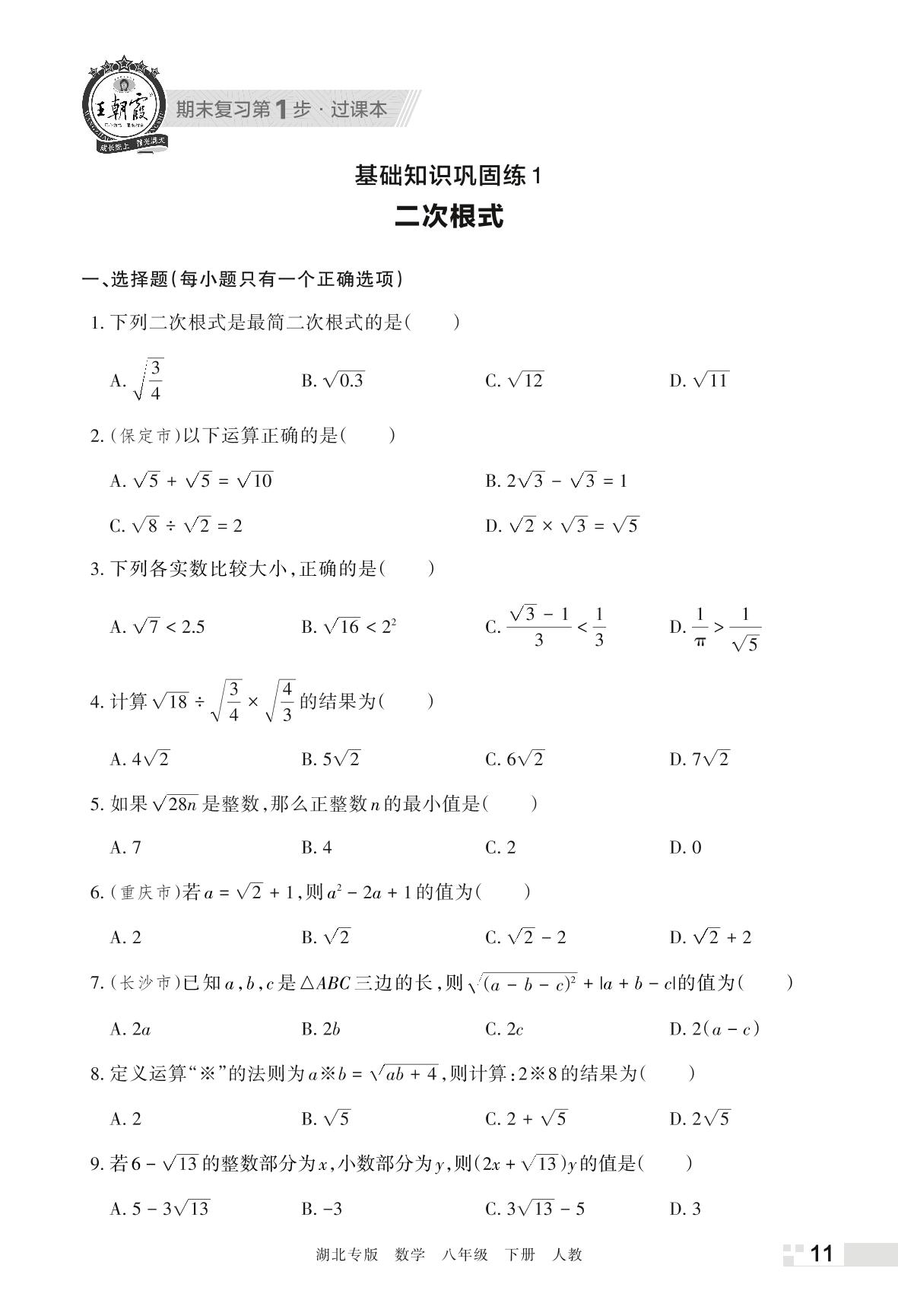 王朝霞期末过课本——基础知识巩固练1 二次根式八年级下册数学(人教版)_R220319100950613