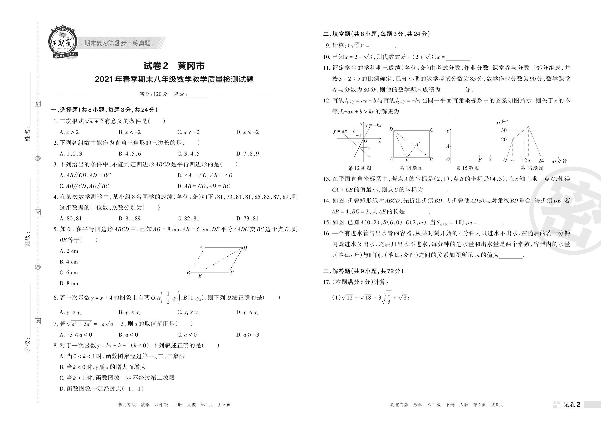 黄冈市2021年春季期末八年级数学教学质量检测试题(人教版)【2】
