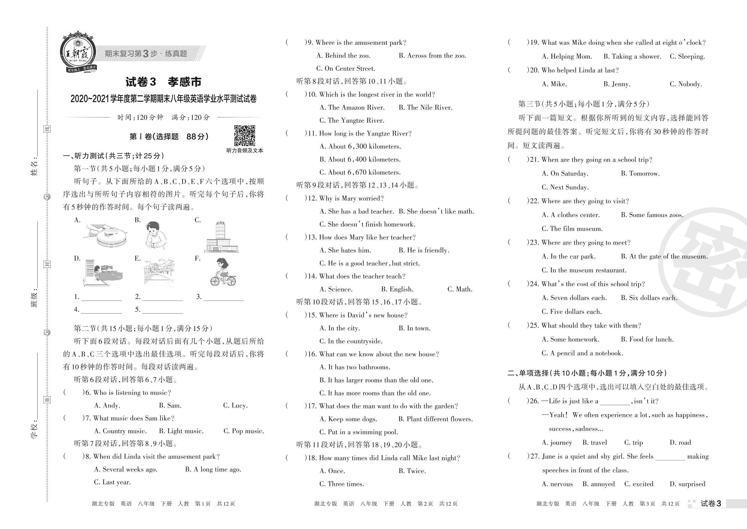 孝感市2020~2021学年度第二学期期末八年级英语学业水平测试试卷(人教版)【3】