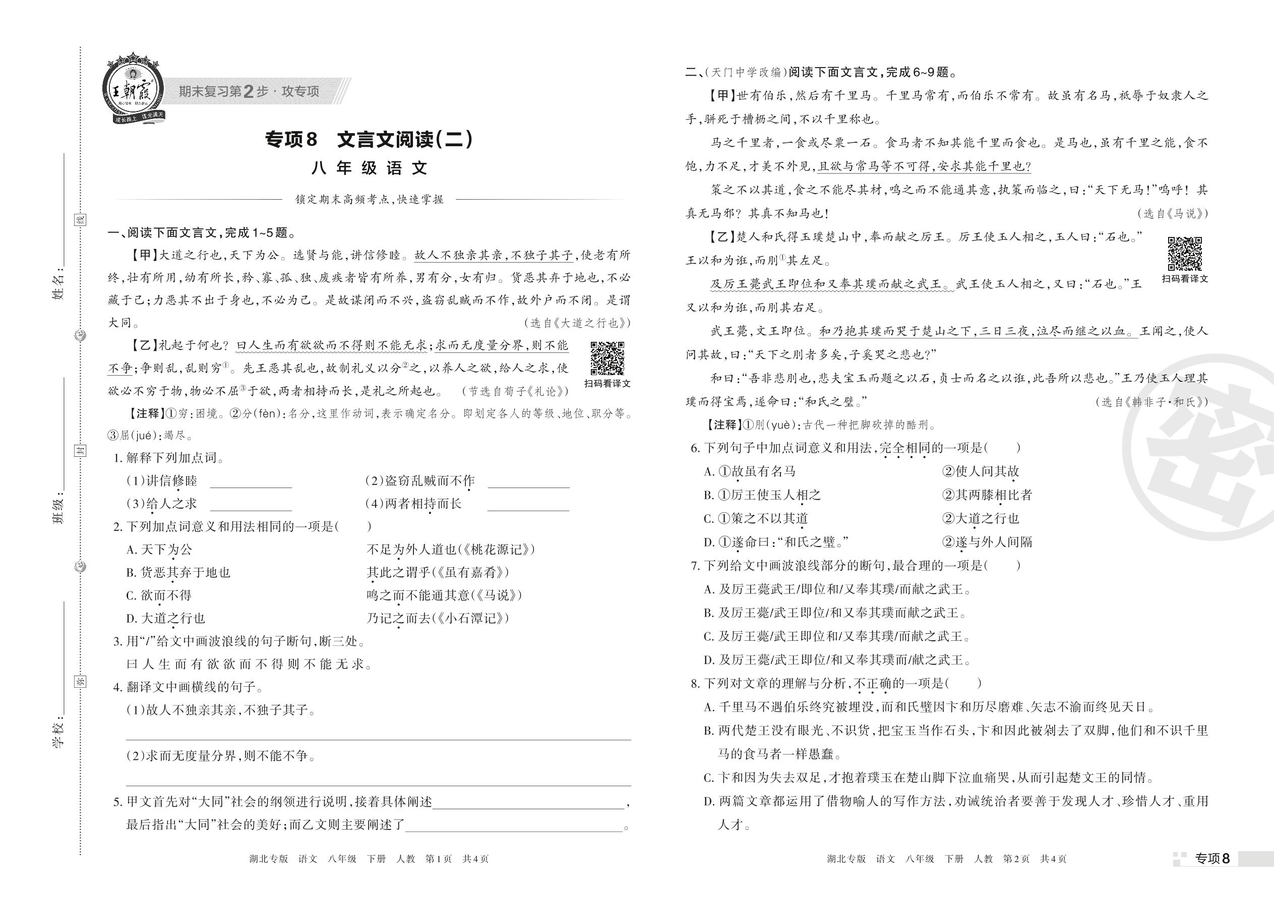 王朝霞期末专项卷——文言文阅读(二)八年级下册语文(人教版)【8】