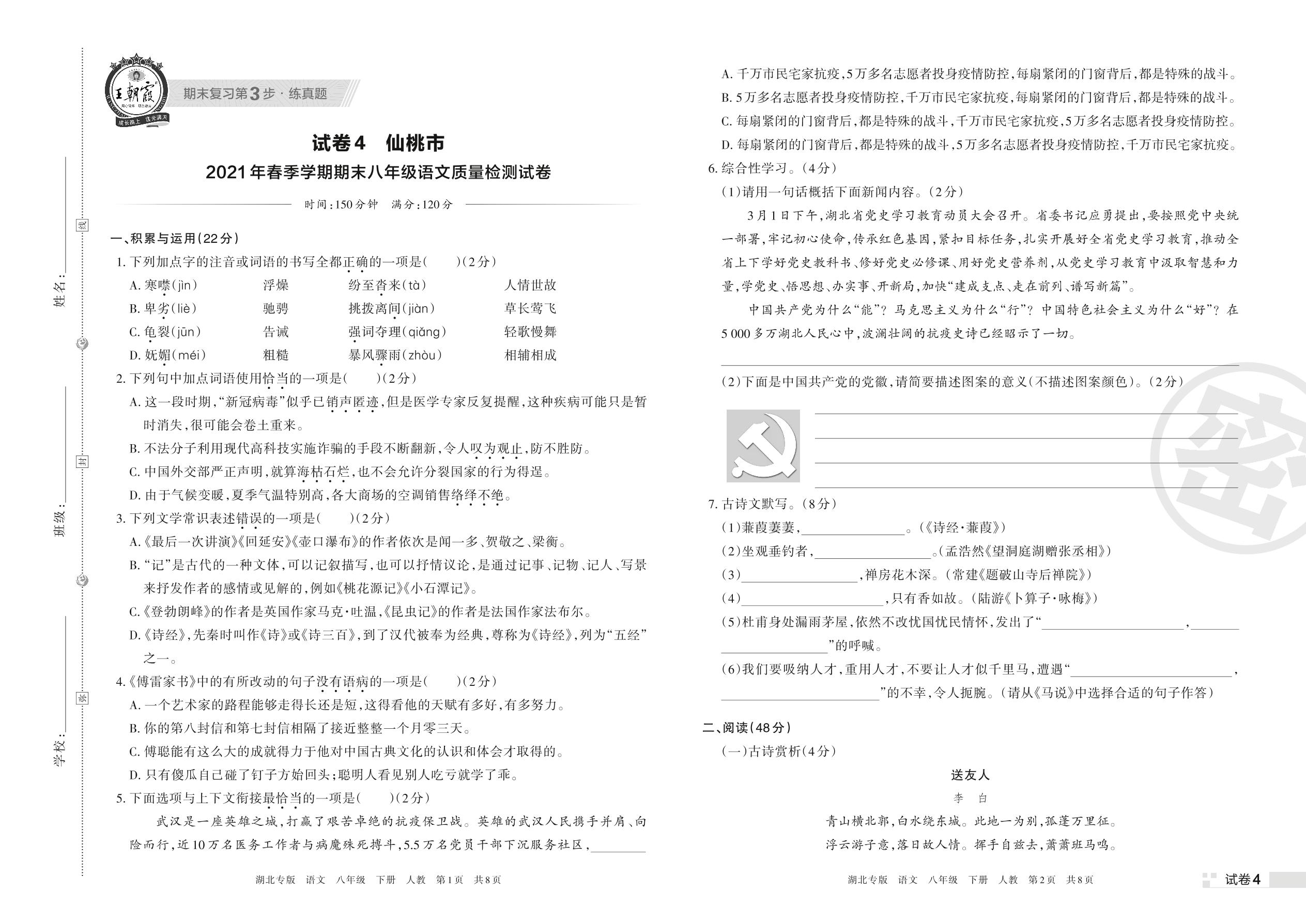 仙桃市2021年春季学期期末八年级语文质量检测试卷(人教版)【4】