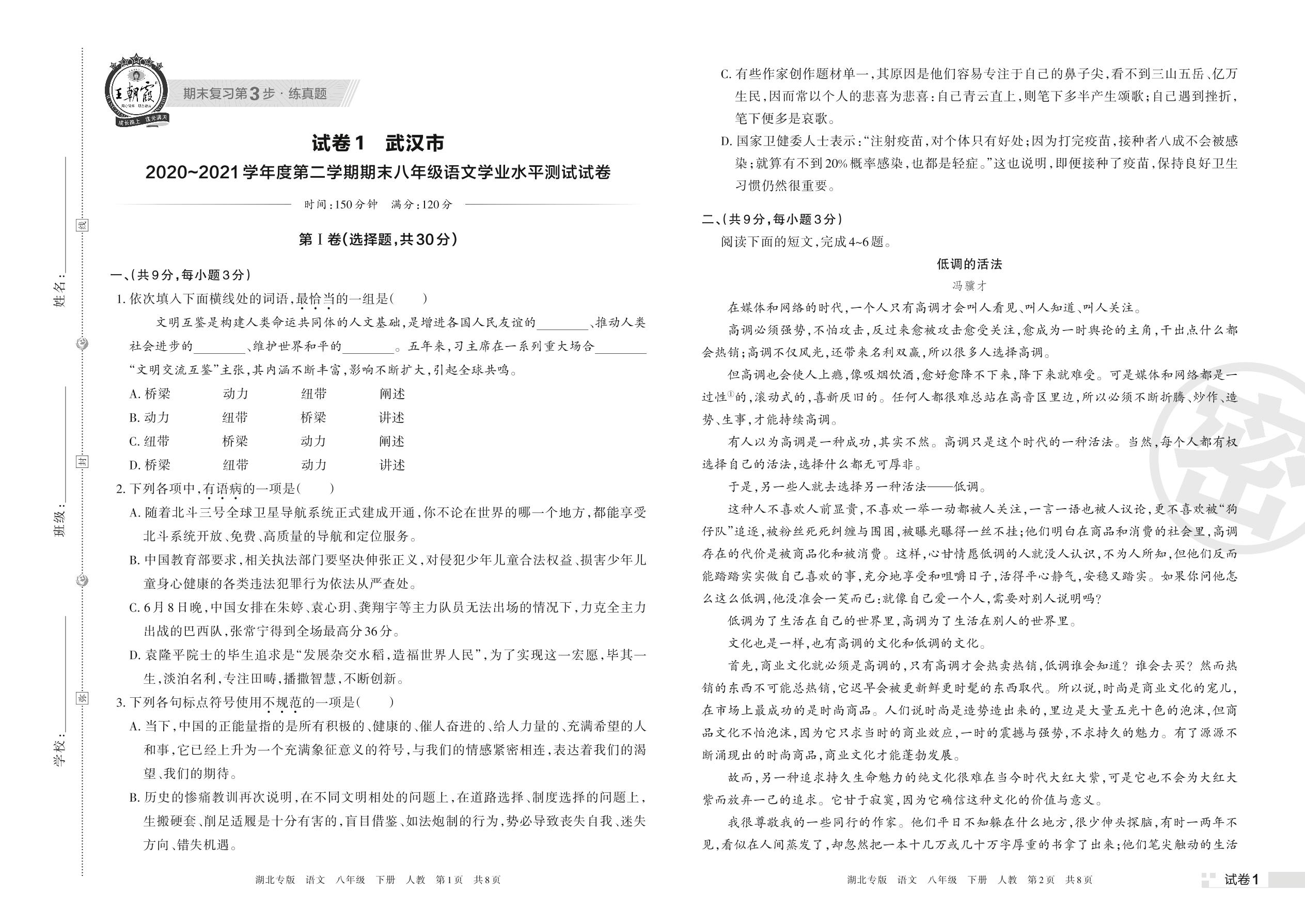武汉市2020~2021学年度第二学期期末八年级语文学业水平测试试卷(人教版)【1】