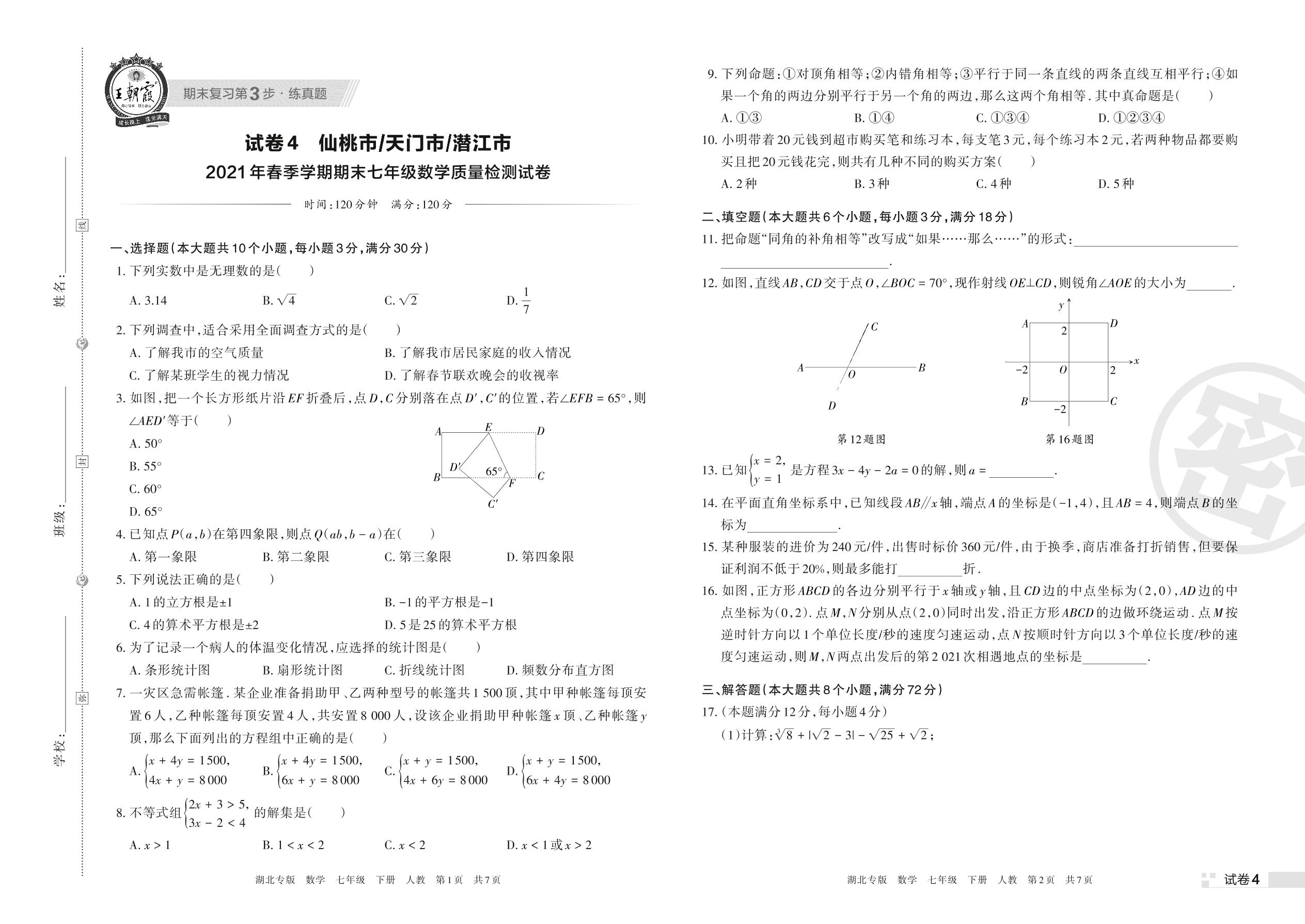 仙桃市、天门市、潜江市2021年春季学期期末七年级数学质量检测试卷(人教版)【4】