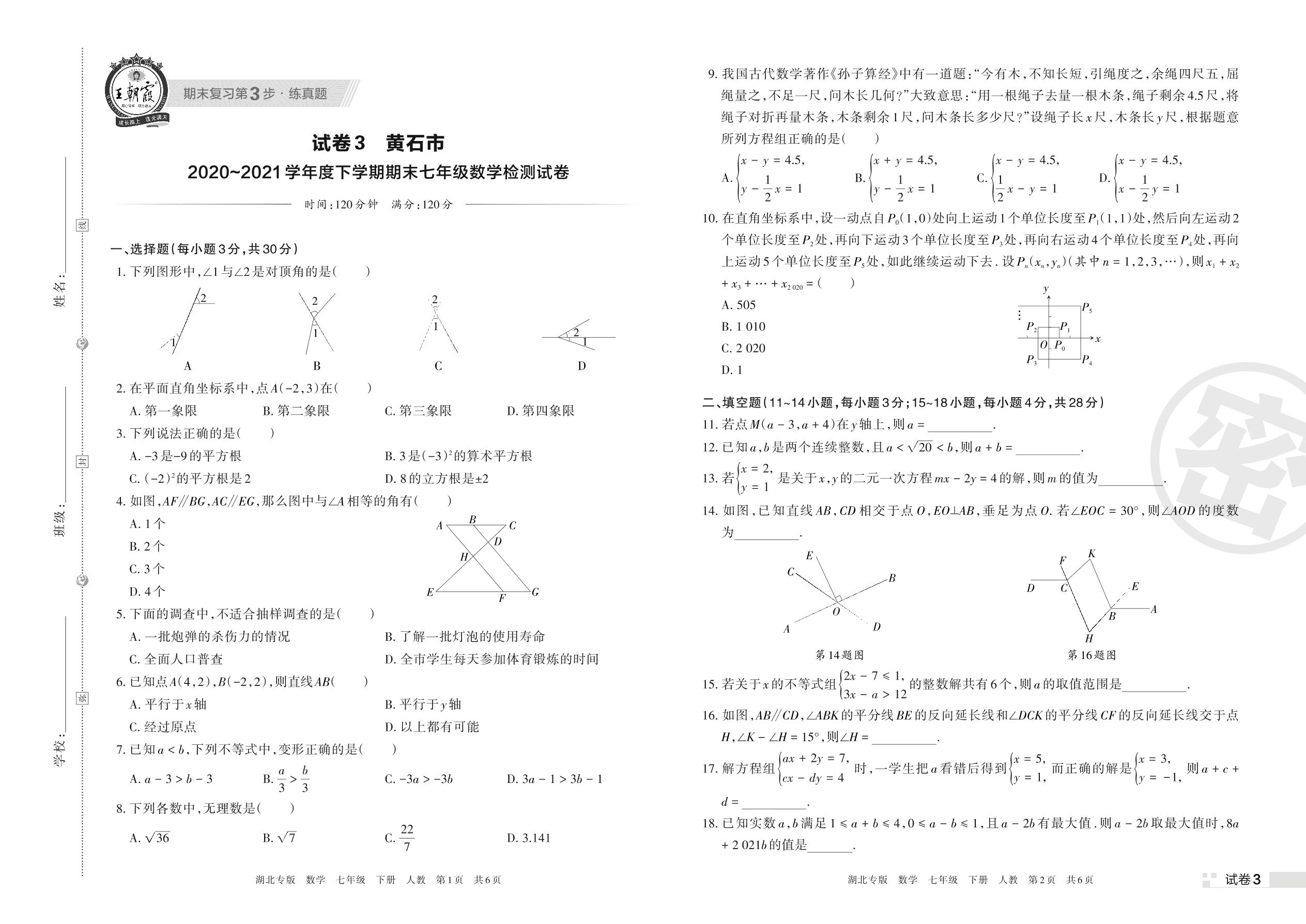 黄石市2020~2021学年度下学期期末七年级数学检测试卷(人教版)【3】