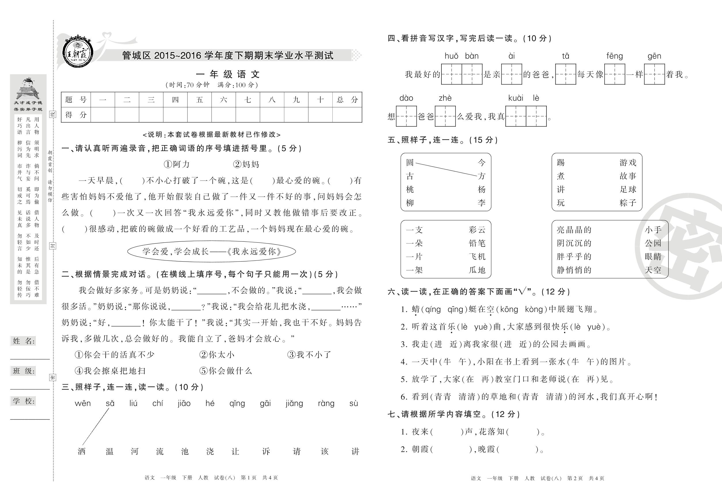 2015-2016学年第二学期郑州市管城区一年级语文试卷(人教版)【8】