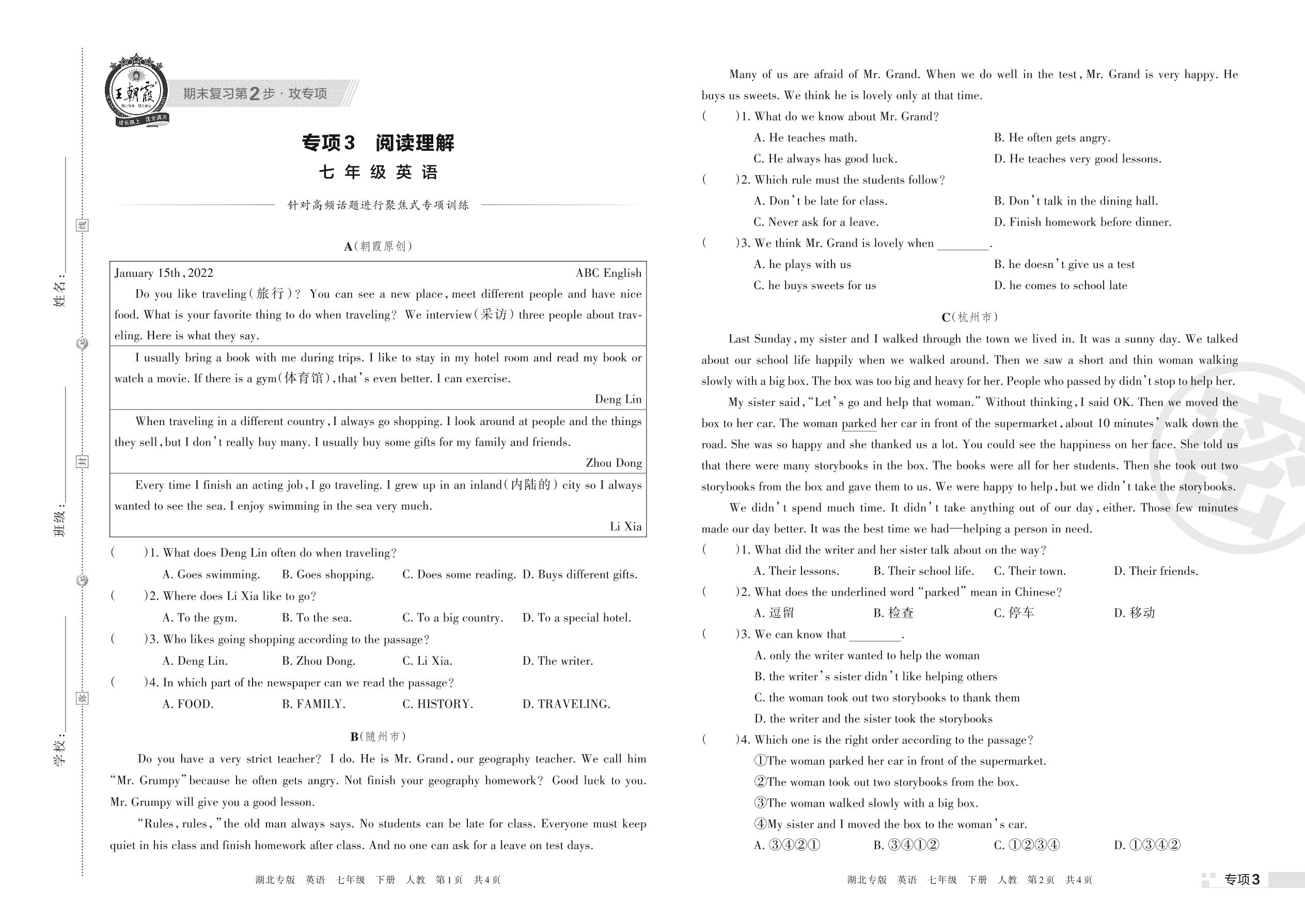 王朝霞期末专项卷——阅读理解七年级下册英语(人教版)【3】