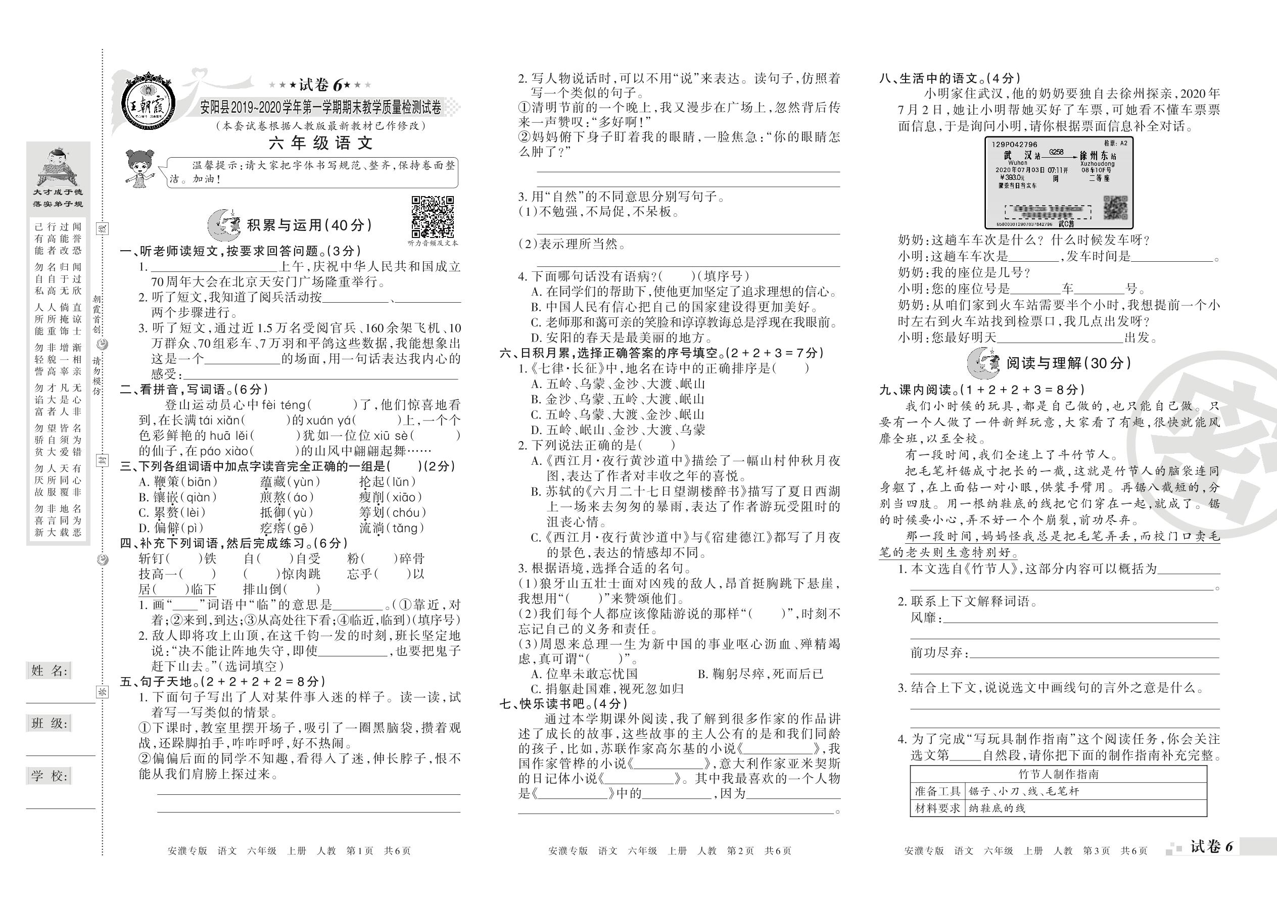 2019-2020学年第一学期安阳市安阳县六年级语文试卷(人教版)【6】