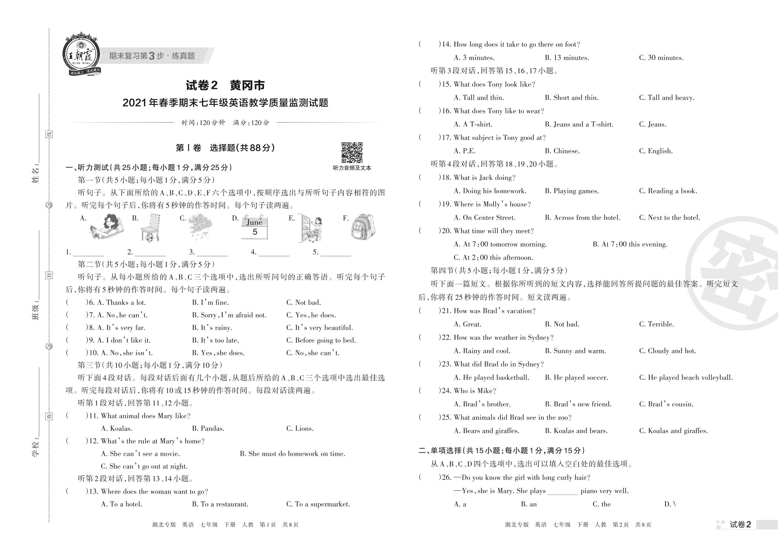 黄冈市2021年春季期末七年级英语教学质量监测试题(人教版)【2】
