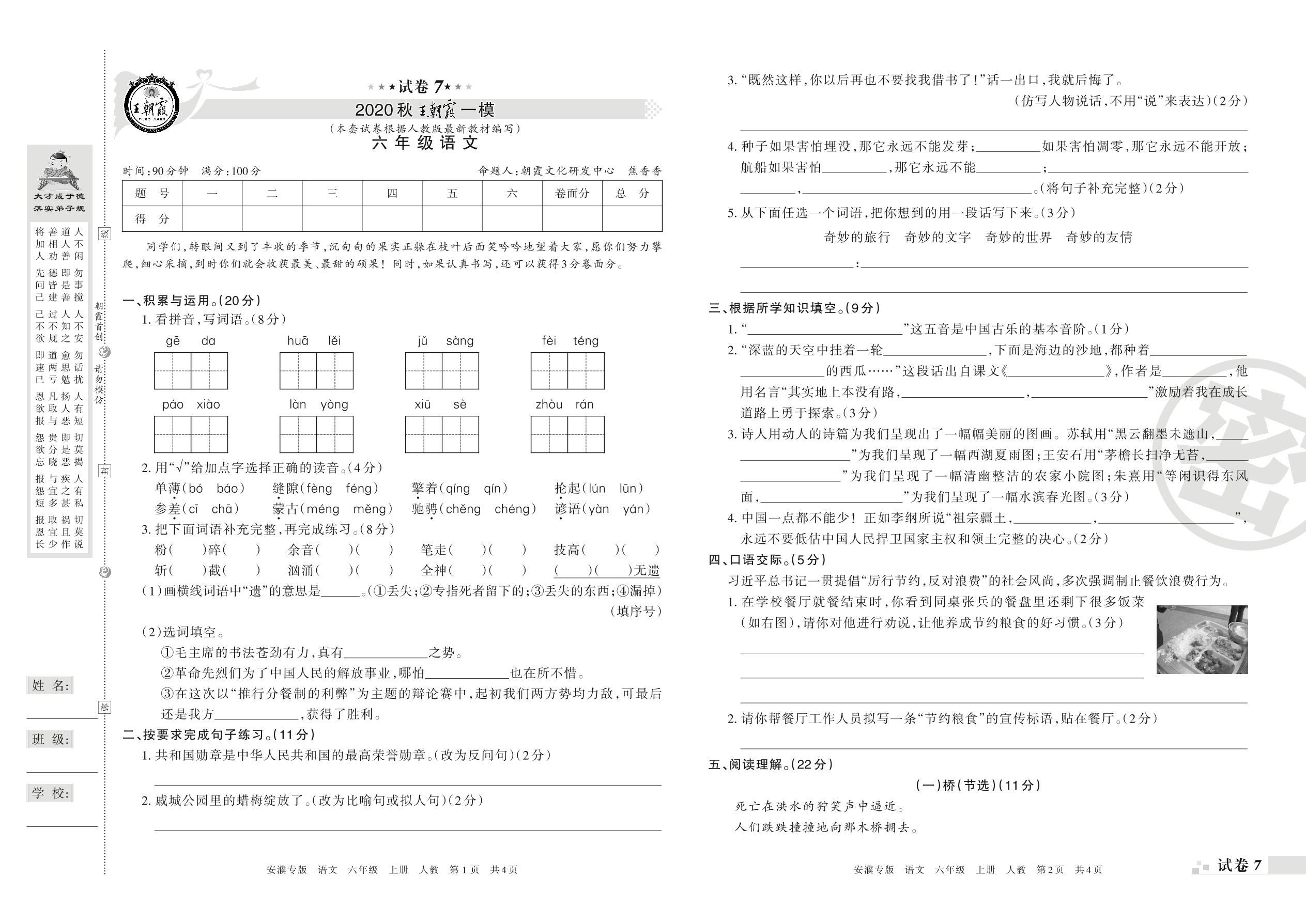 王朝霞期末模拟卷六年级上册语文(人教版)_R21080211252【7】