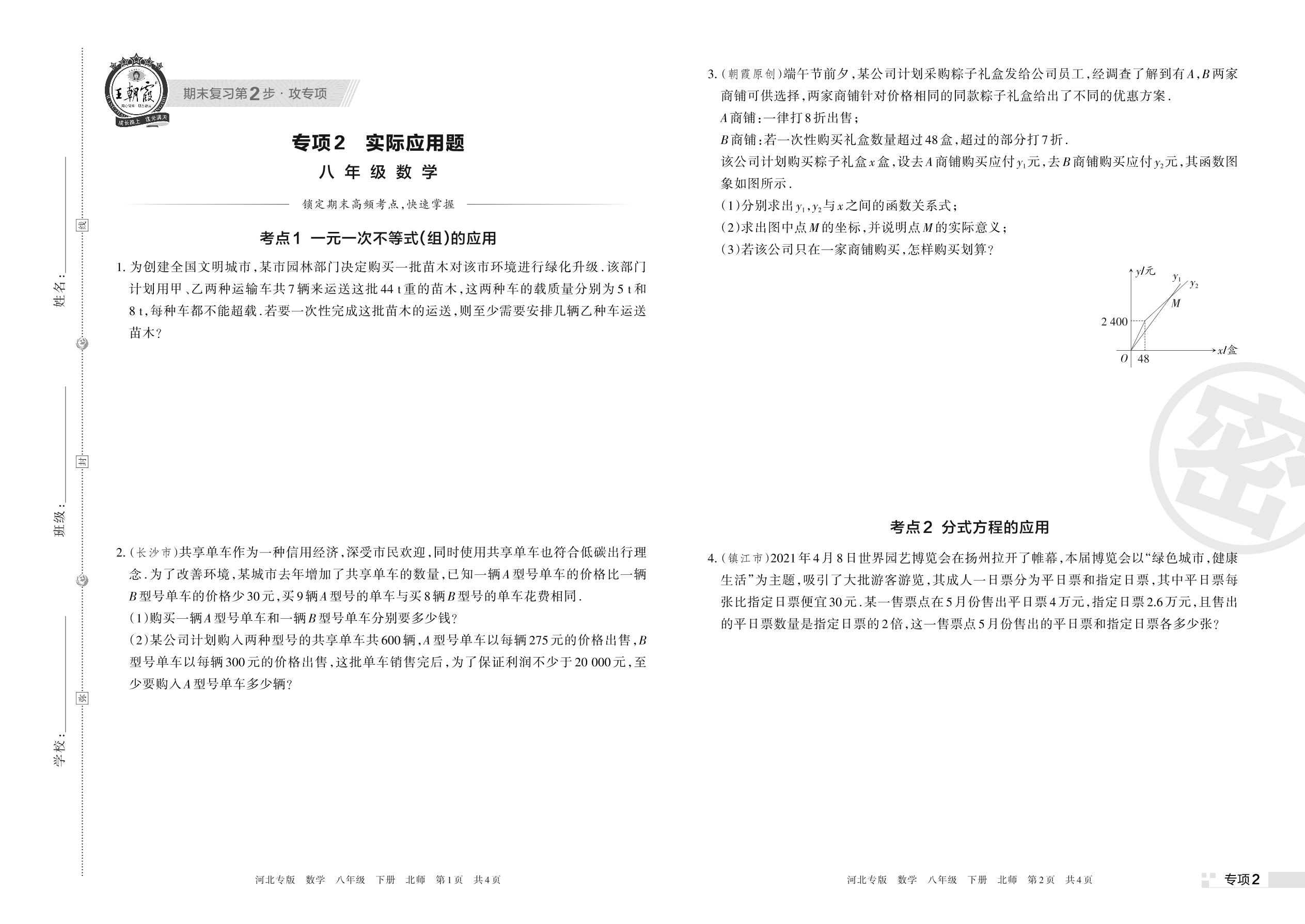 王朝霞期末专项卷——实际应用题八年级下册数学(北师版)【2】