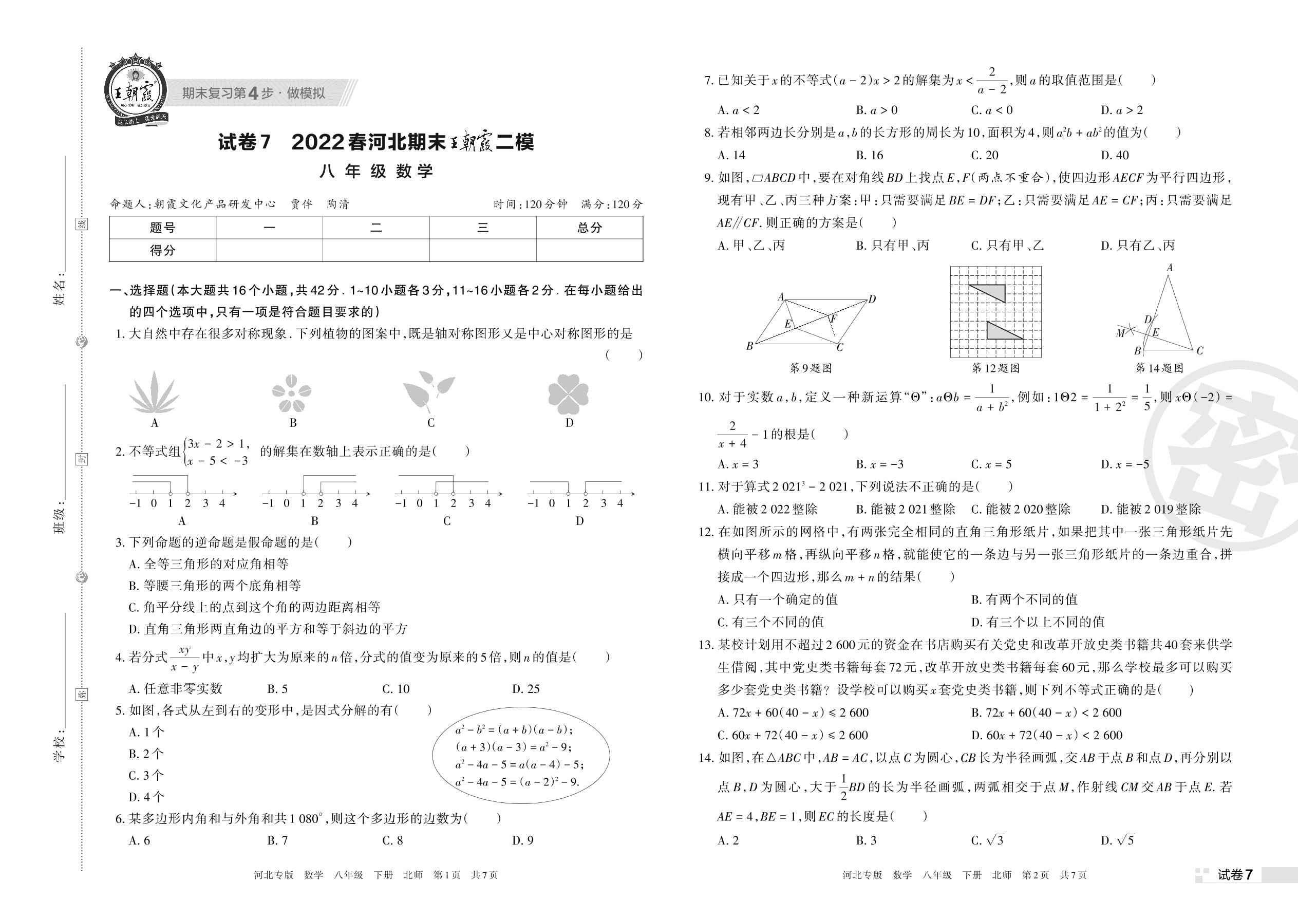 王朝霞期末模拟卷八年级下册数学(北师版)【7】