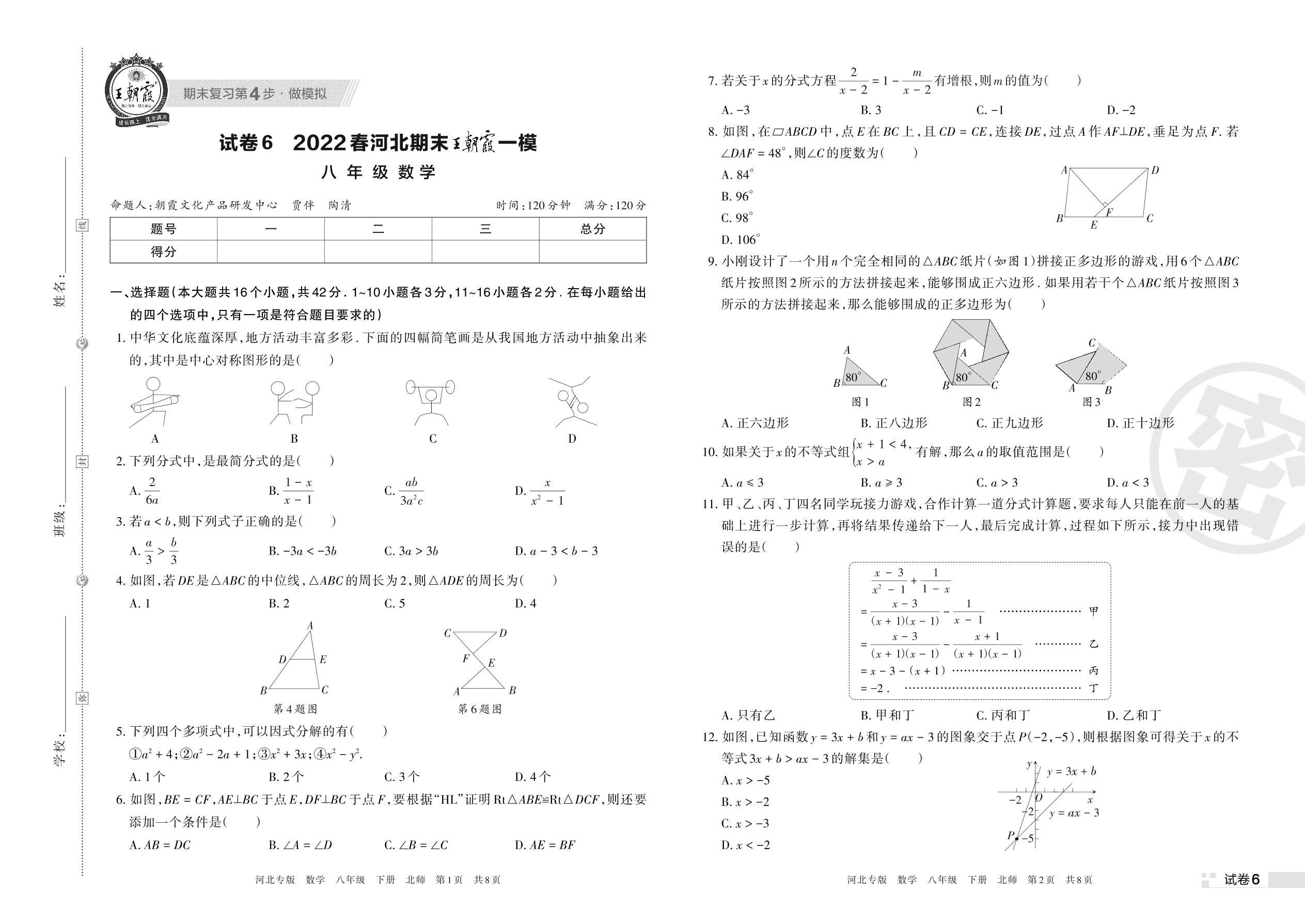 王朝霞期末模拟卷八年级下册数学(北师版)【6】