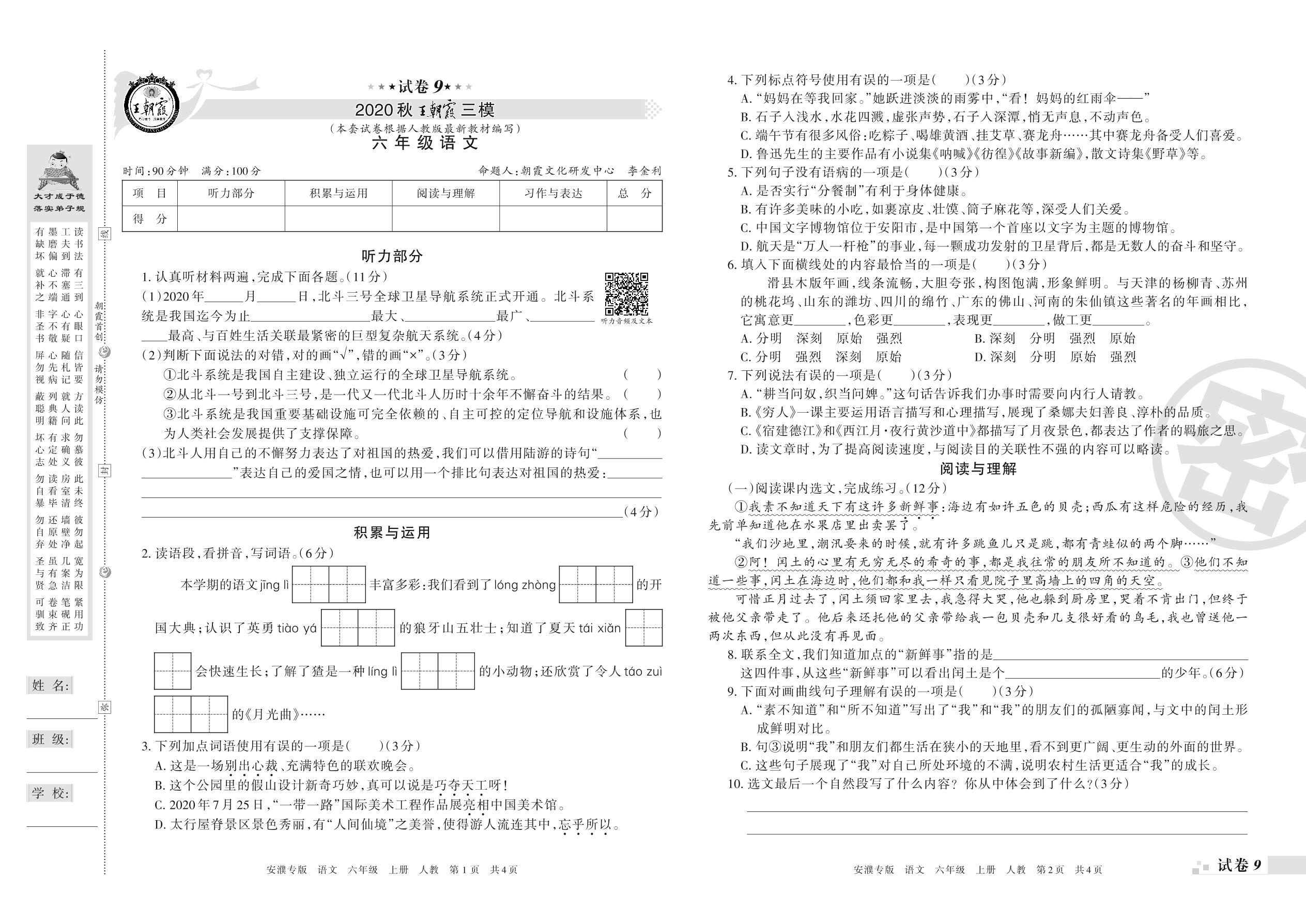 王朝霞期末模拟卷六年级上册语文(人教版)_R21080211300【9】