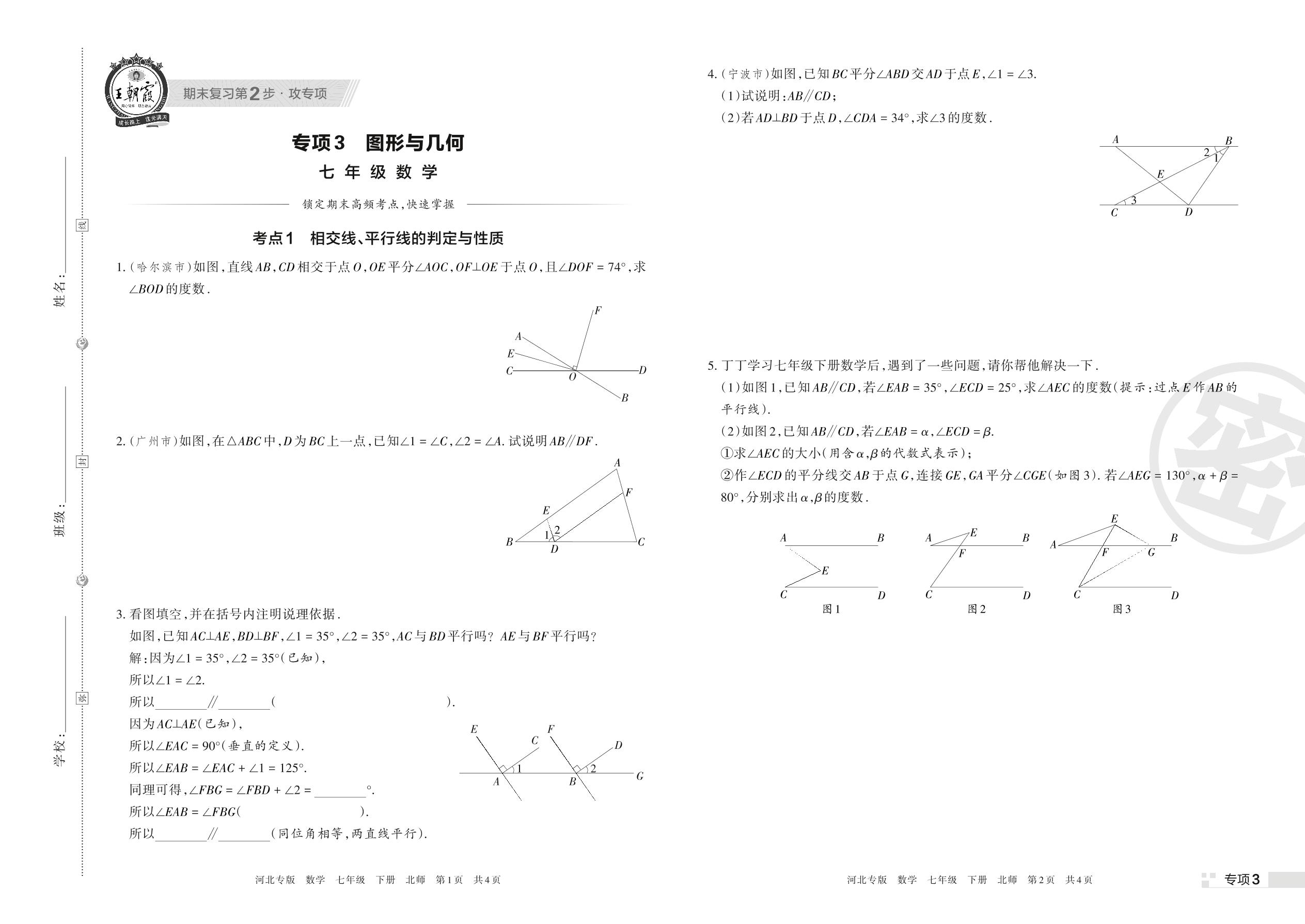 王朝霞期末专项卷——图形与几何七年级下册数学(北师版)【3】
