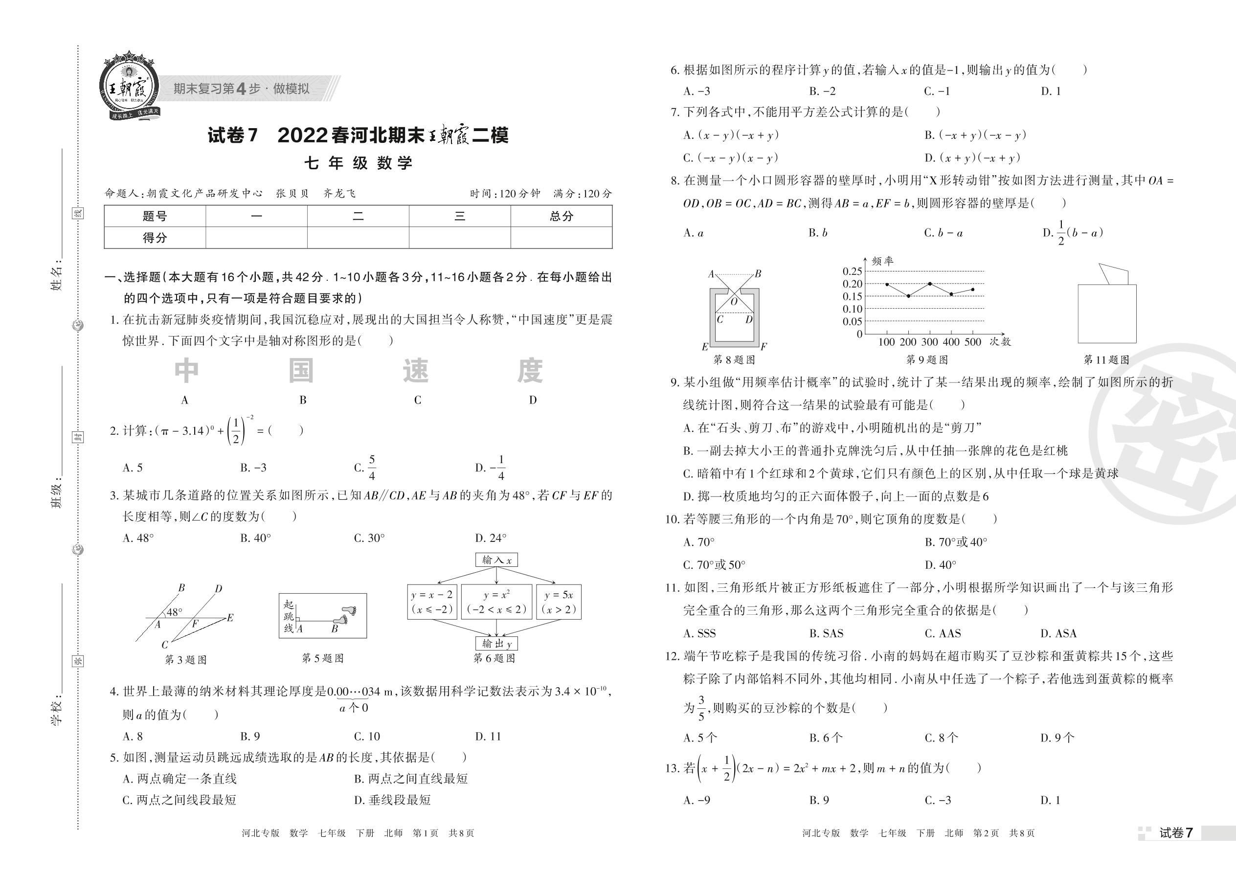 王朝霞期末模拟卷七年级下册数学(北师版)【7】